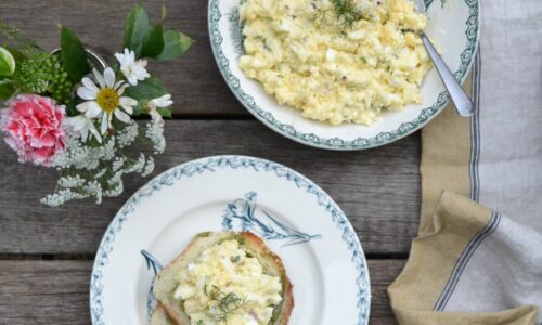 エッグサラダにカッテージチーズを加えた、カッテージチーズエッグサラダ (Cottage Cheese Egg Salad) です。ゆで卵だけで作るエッグサラダよりも、よりクリーミーな食感が持ち味で、よりマイルドな仕上がりになります。味わいがマイルドなので、加えるハーブなどの食材の風味が、よりダイレクトに感じられます。エッグサラダと同様に、ディップのように、フ…