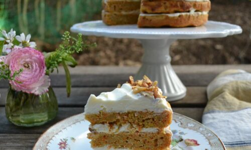 人参をたっぷりと入れて、スパイスをきかせて焼き上げたレイヤーケーキに、クリームチーズで作るフロスティングをトッピングした、キャロットケーキです。アメリカでは人参やパンプキンなど、野菜を入れて作るケーキが多いのですが、キャロットケーキはその中でも代表的なものです。丸いケーキ型を使って焼き、ピーカンなどのナッツで飾りつけをします。かなり大量の人参を使って焼くので…
