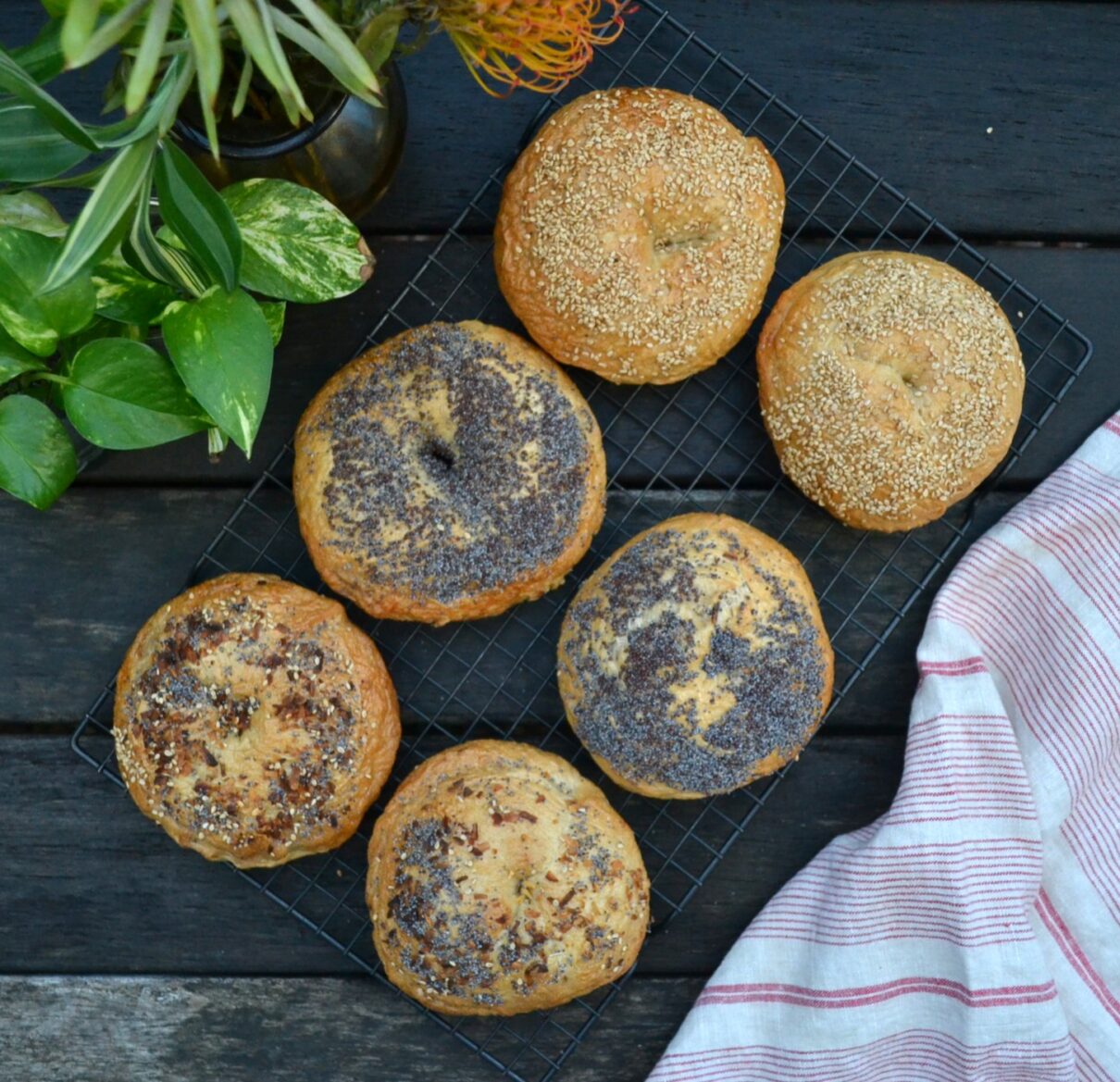 ホシノ天然酵母を使ってやく、ベーグルです。ベーグルは、ポーランドのユダヤ人コミュニティーが発祥の、ドーナツ型のパンです。生地を一度お湯にくぐらせてから、オーブンで焼き上げることによって、内側にもちっとした食感を残し、外側をパリッと焼き上げるのが特徴です。生地自体は、基本的には小麦粉と水だけで作り、油脂や乳製品を使わないシンプルなパンなので、小麦粉のうま味が生きています。