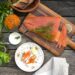スモークサーモン、玉ねぎのピクルス、ケッパー、ハーブなどをのせます。