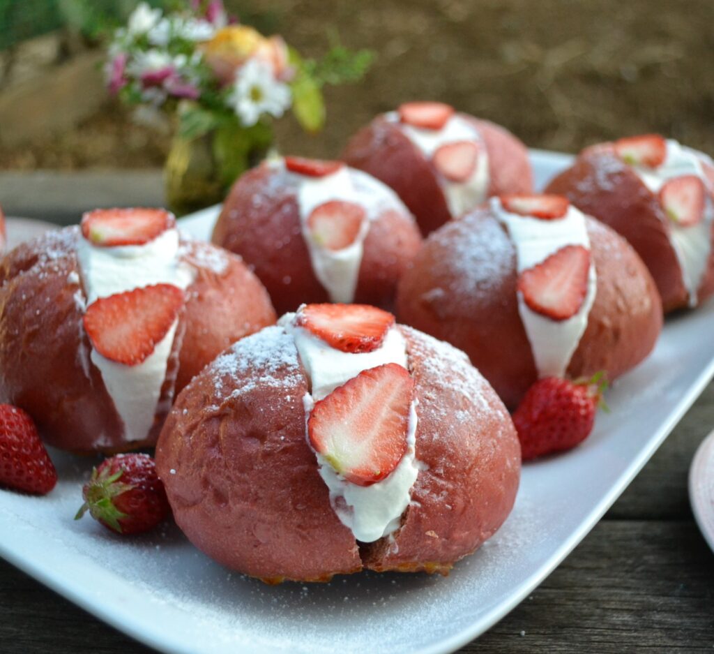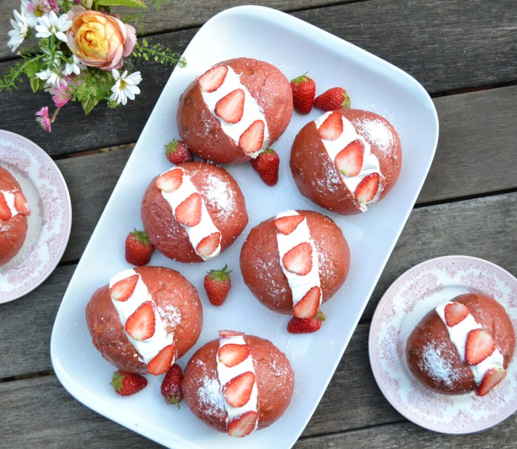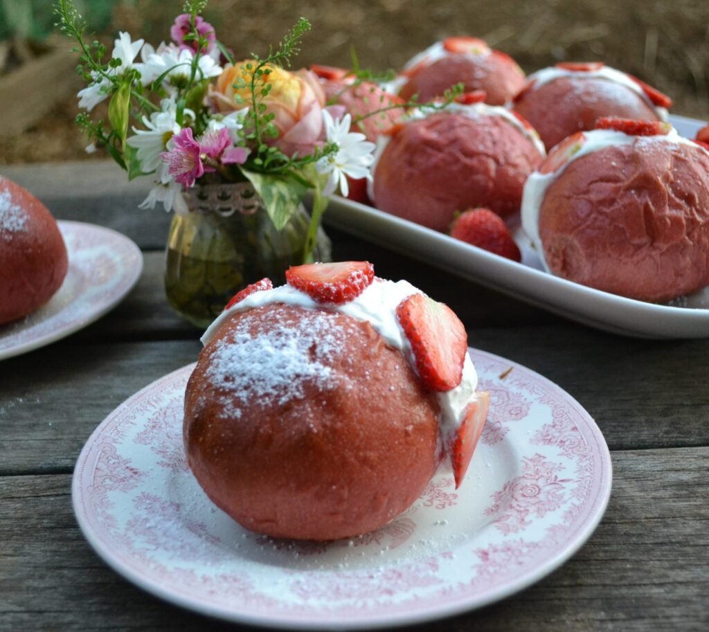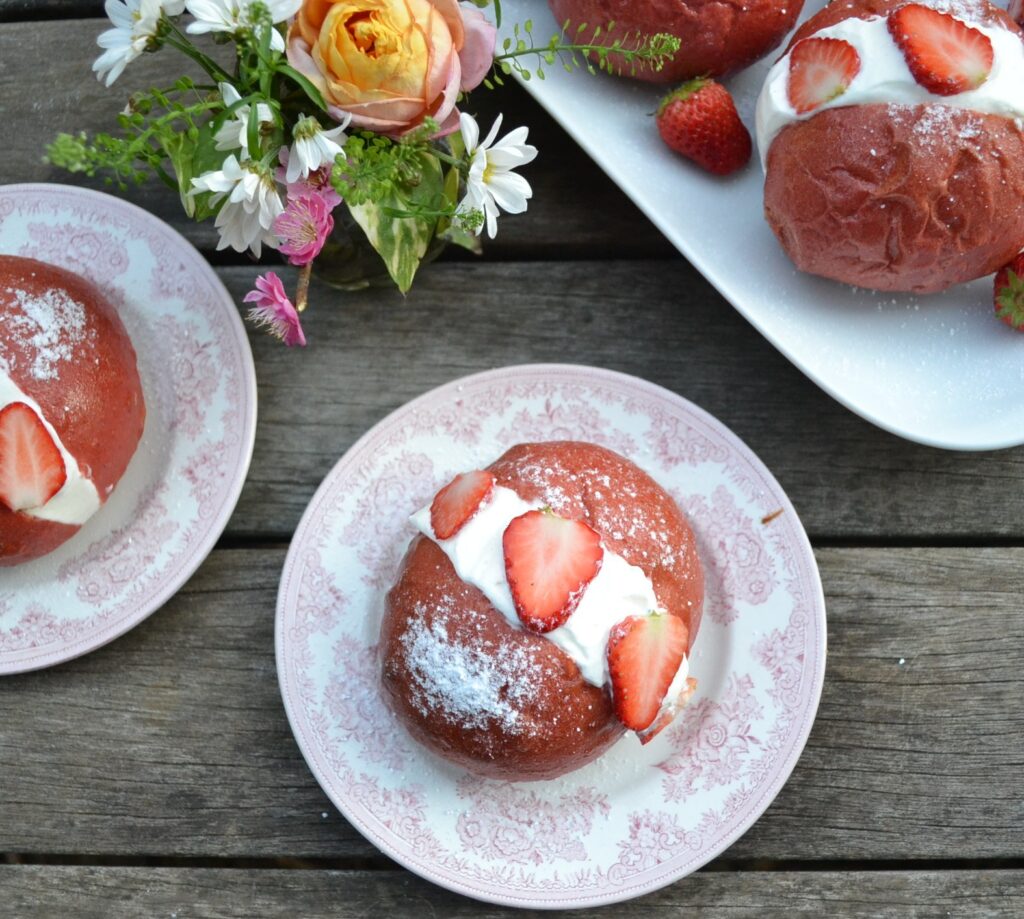 生地にピューレ状にしたビーツを加えて焼き上げて、たっぷりの生クリームと苺を挟んだ、ビーツマリトッツオ (Beetroot Maritozzi) です。マリトッツオは、ふわふわのパンを丸く焼き上げて作る、イタリアのクリームバンです。丸いかわいらしい見た目が印象的なパンです。ビーツを生地に加えると、鮮やかな赤色が美しい、より華やかなマリオトッツオになります。ビーツの風味はほとんど感じませんが、生地が赤くなるだけで、なぜか、ベリー系の風味が感じられるような気がします。苺以外のフルーツをあわせてもいいし、チョコレートやココアで仕上げてもよく合います。