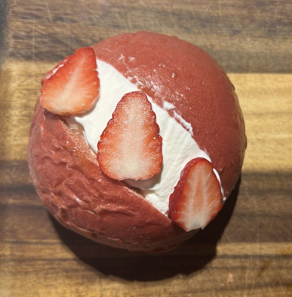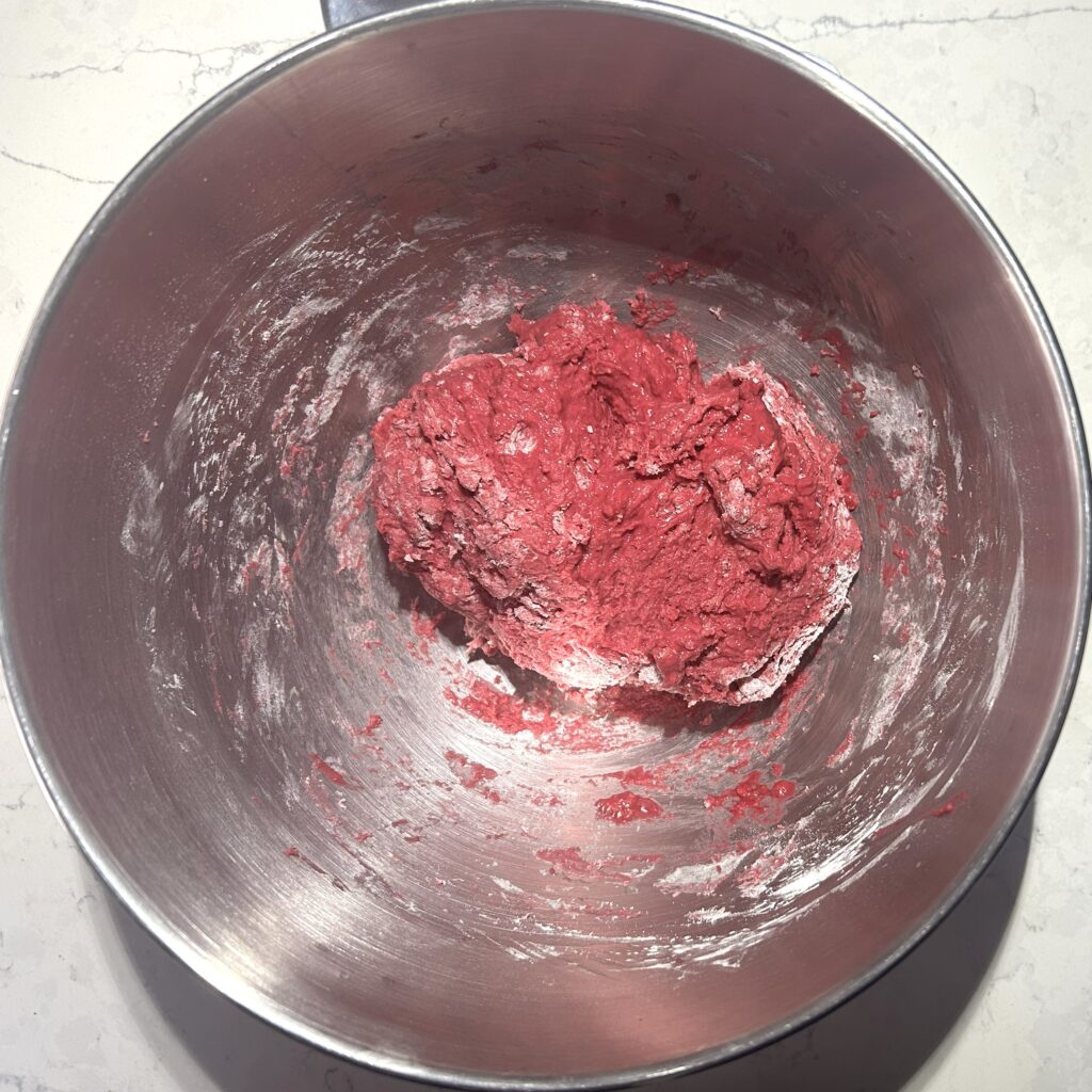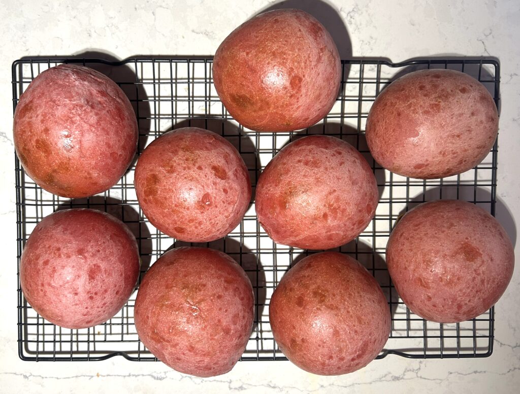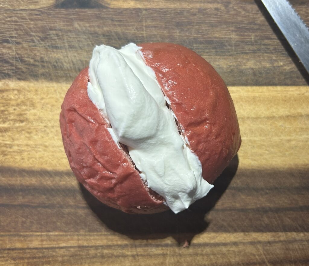 生地にピューレ状にしたビーツを加えて焼き上げて、たっぷりの生クリームと苺を挟んだ、ビーツマリトッツオ (Beetroot Maritozzi) です。マリトッツオは、ふわふわのパンを丸く焼き上げて作る、イタリアのクリームバンです。丸いかわいらしい見た目が印象的なパンです。ビーツを生地に加えると、鮮やかな赤色が美しい、より華やかなマリオトッツオになります。ビーツの風味はほとんど感じませんが、生地が赤くなるだけで、なぜか、ベリー系の風味が感じられるような気がします。苺以外のフルーツをあわせてもいいし、チョコレートやココアで仕上げてもよく合います。