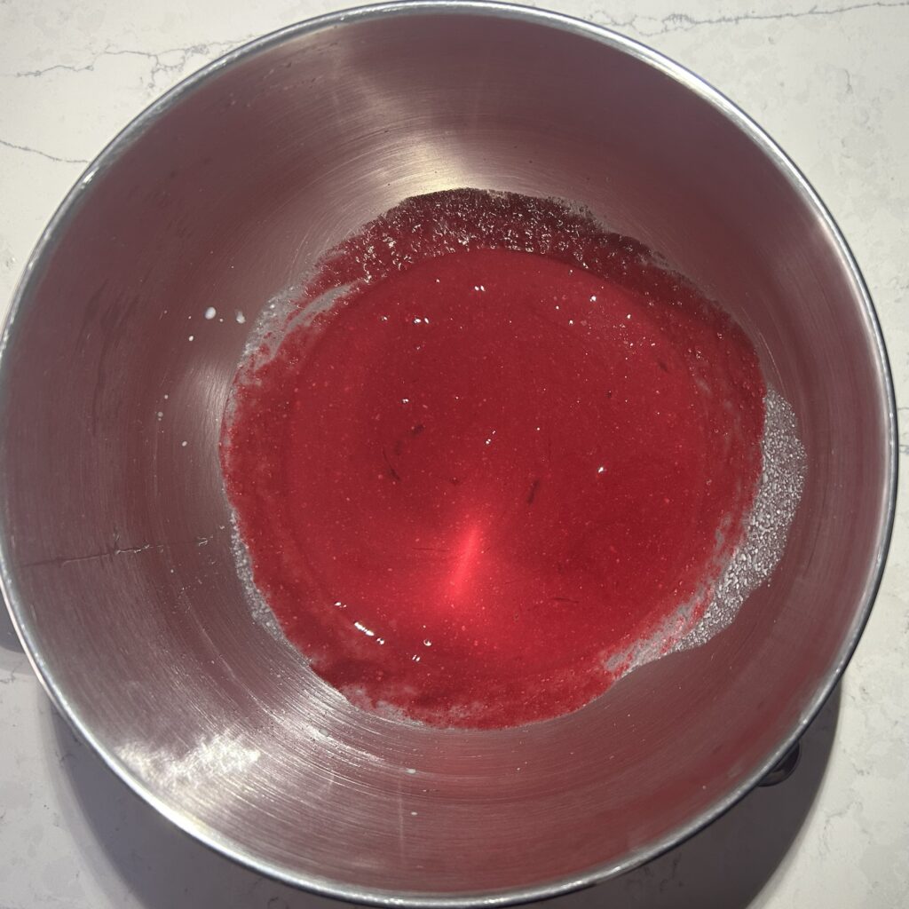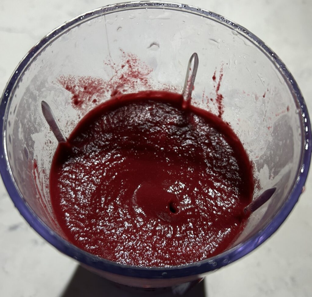 ピューレ状になるまで、攪拌します。ピューレ状にしたビーツを200グラム使います。余ったビーツは、スムージに加えたり、他のお菓子や料理に利用します。