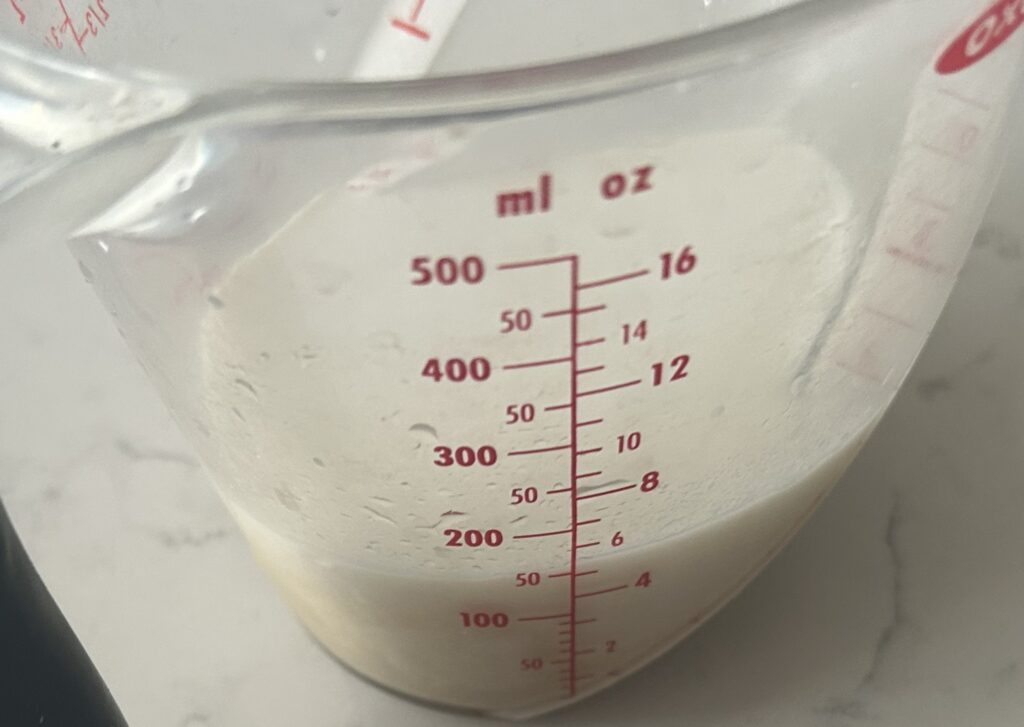 生種起こしをした天然酵母に牛乳とあわせて、150 ml になるように調整します。ホシノの天然酵母25グラム分を、あらかじめ生種起こしをして、使っています。具体的な方法はこちらを参考にしてください