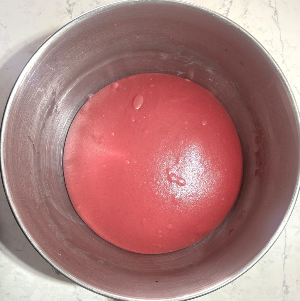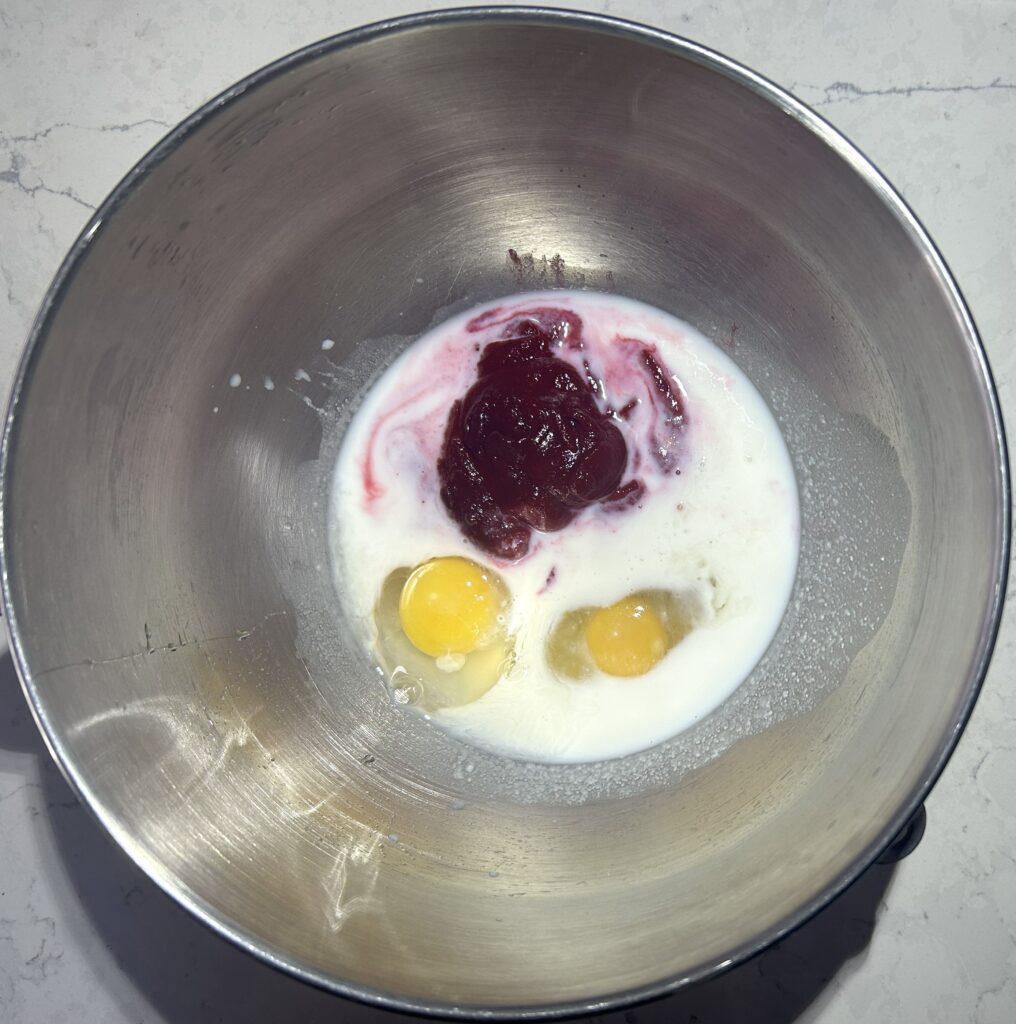 牛乳と天然酵母、卵、ビーツのピューレをボールに入れて、混ぜ合わせます。