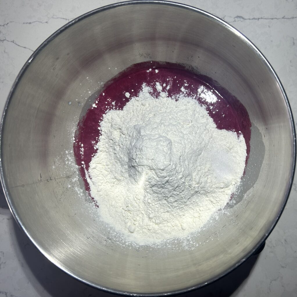 ❸ボールに卵、牛乳と混ぜ合わせた天然酵母、ビーツのピューレ、砂糖を入れて混ぜ合わせる。さらに小麦粉、塩を加えて、粉っぽさがなくなるまで混ぜ合わせる。