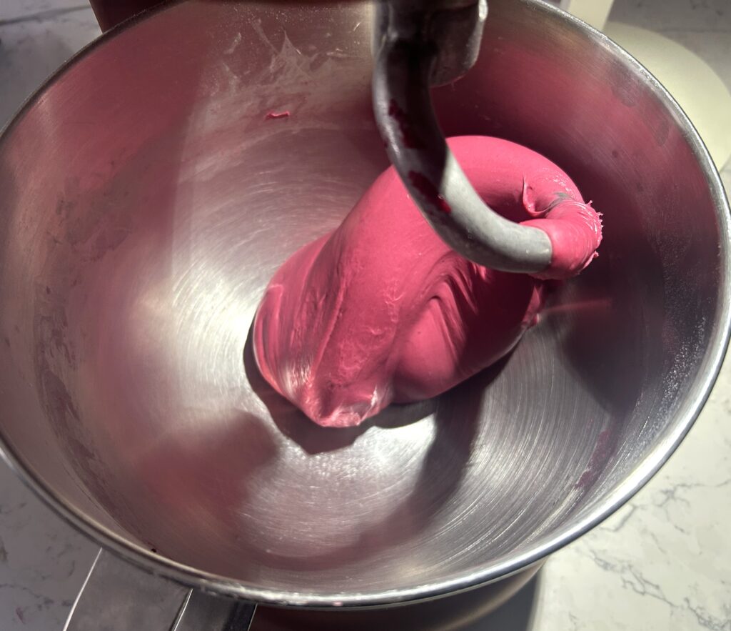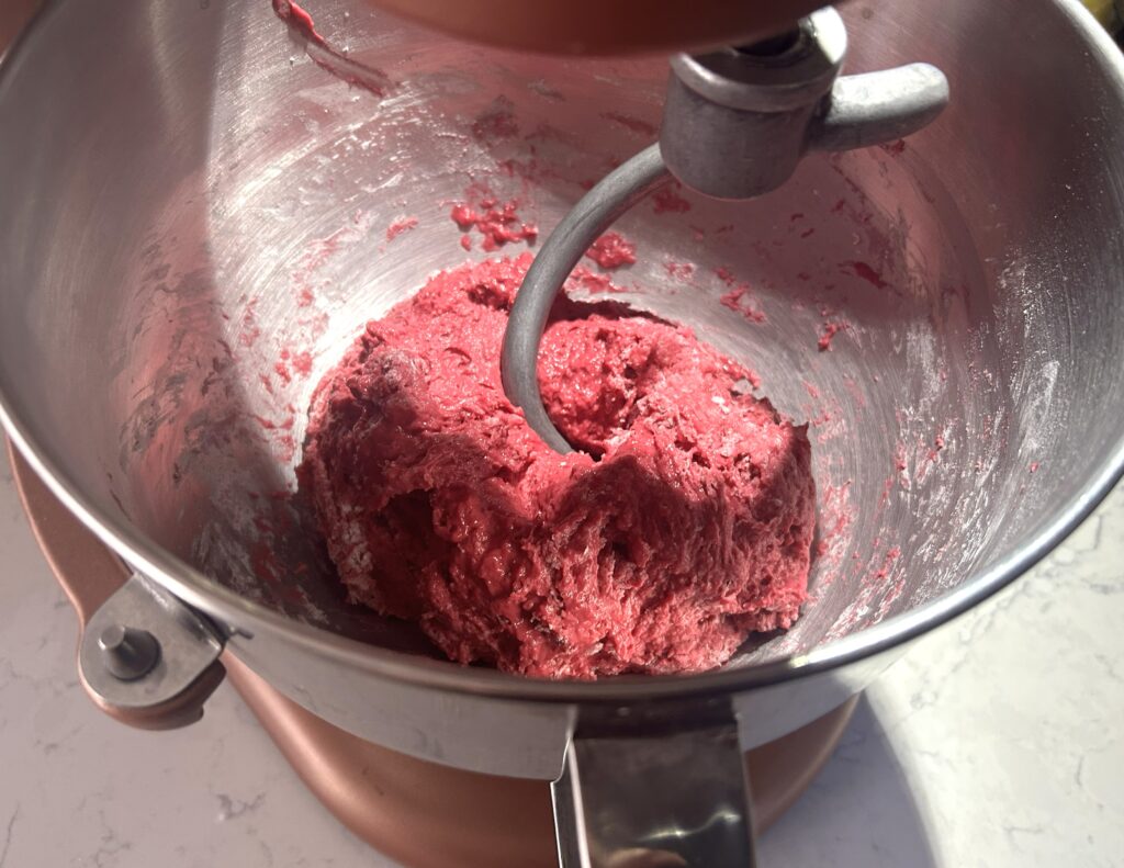 スタンドミキサーにセットして、生地の表面がなめらかな感じになるまで、捏ねます。生地が軟らかすぎるようだったら、少量の小麦粉を加えて、調節します。