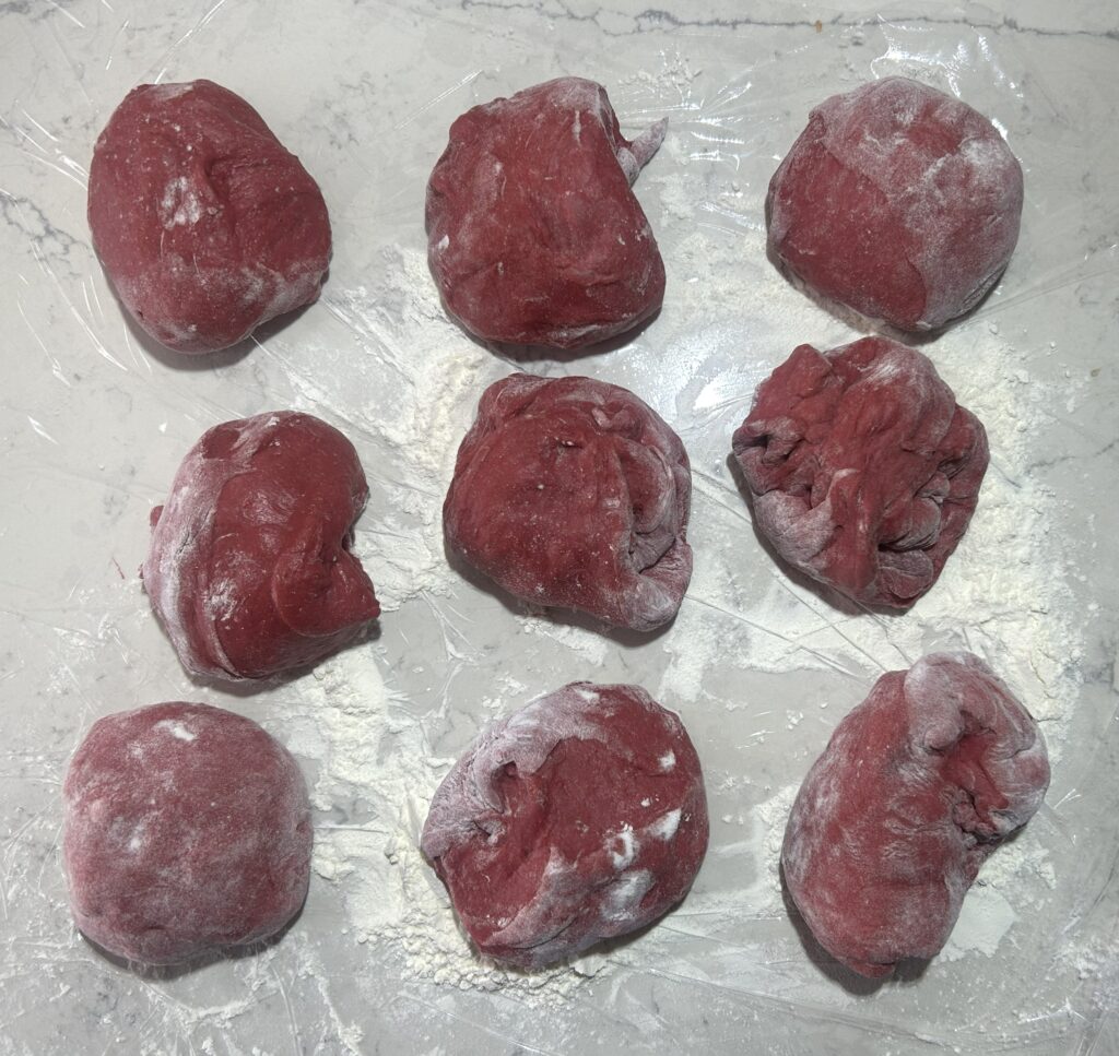 生地を9等分から12等分にして、円形に丸めます。一つ当たり100グラムから120グラム程度の大きさにそろえます。