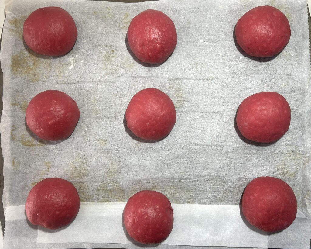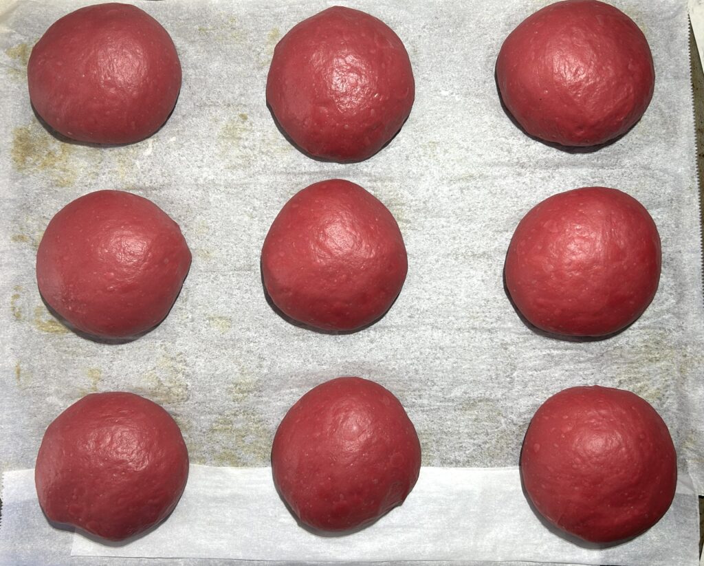 ❻生地を9等分にして丸める。ベーキング用の紙を敷いた鉄板の上に、間隔をあけて並べる。乾燥させないように、表面に軽く切り吹きで水をかけ、暖かい室内において、一回り大きくなるまで、発酵させる。