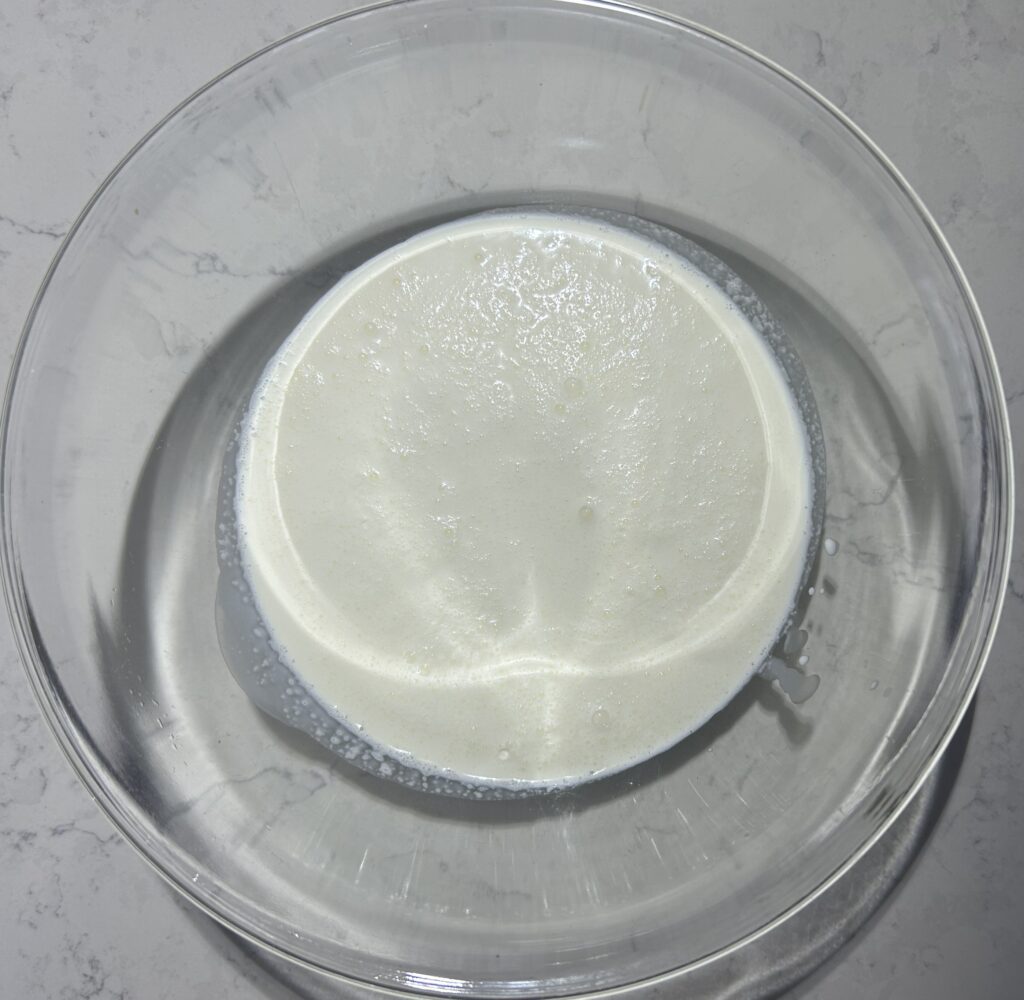 ❷生種起こしをしたホシノ天然酵母に、牛乳をまぜあわせて、150 mlになるように調整する。