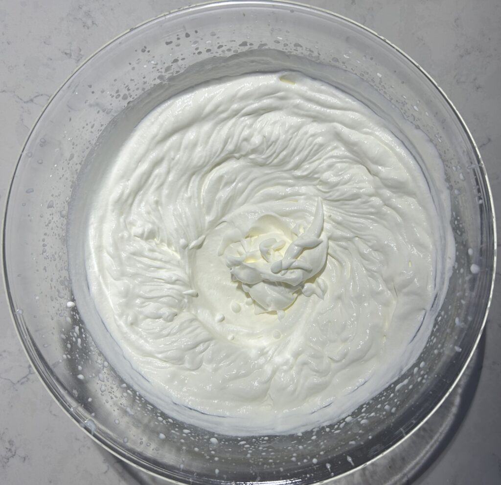 ❾フィリング用の生クリームと粉砂糖、バニラエクストラクトをボールに入れる。泡立て器で、角が立つまで泡立てる。