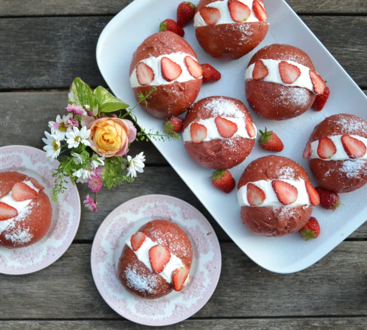 生地にピューレ状にしたビーツを加えて焼き上げて、たっぷりの生クリームと苺を挟んだ、ビーツマリトッツオ (Beetroot Maritozzi) です。マリトッツオは、ふわふわのパンを丸く焼き上げて作る、イタリアのクリームバンです。丸いかわいらしい見た目が印象的なパンです。ビーツを生地に加えると、鮮やかな赤色が美しい、より華やかなマリオトッツオになります。ビーツの風味はほとんど感じませんが、生地が赤くなるだけで、なぜか、ベリー系の風味が感じられるような気がします。苺以外のフルーツをあわせてもいいし、チョコレートやココアで仕上げてもよく合います。