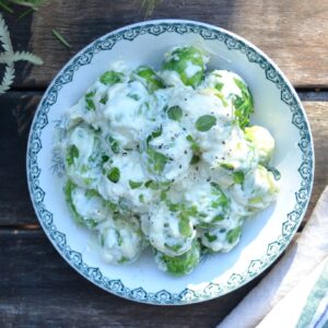 器にもりつけて、バジルなどのハーブの葉を散らします。好みで、さらにブルーチーズをトッピングしてもいいです。