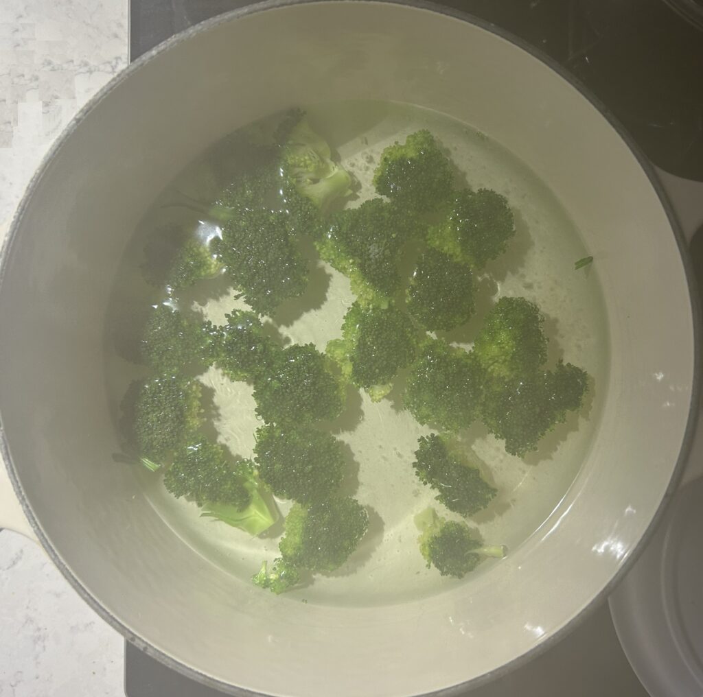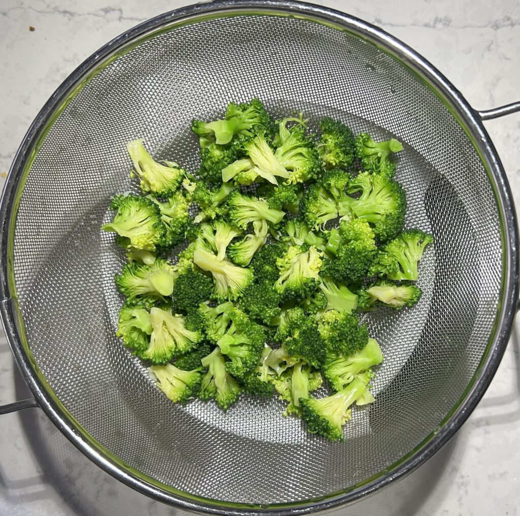 ブロッコリーは冷凍のものを解凍して使ってもいいですが、今回は、フレッシュなものを下茹でしたから使っています。ブロッコリーは、幹を取り除き、大きめに切りそろえます。熱湯をわかして、ブロッコリーを入れて、色が変わるまで、3分程度、硬めに茹でます。