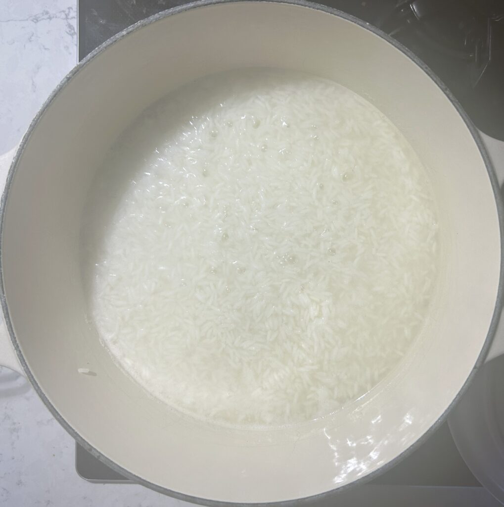 お米と、チキンブロスやベジタブルブロスを鍋に入れます。ブロスがなかったら、水で炊いても美味しいです。