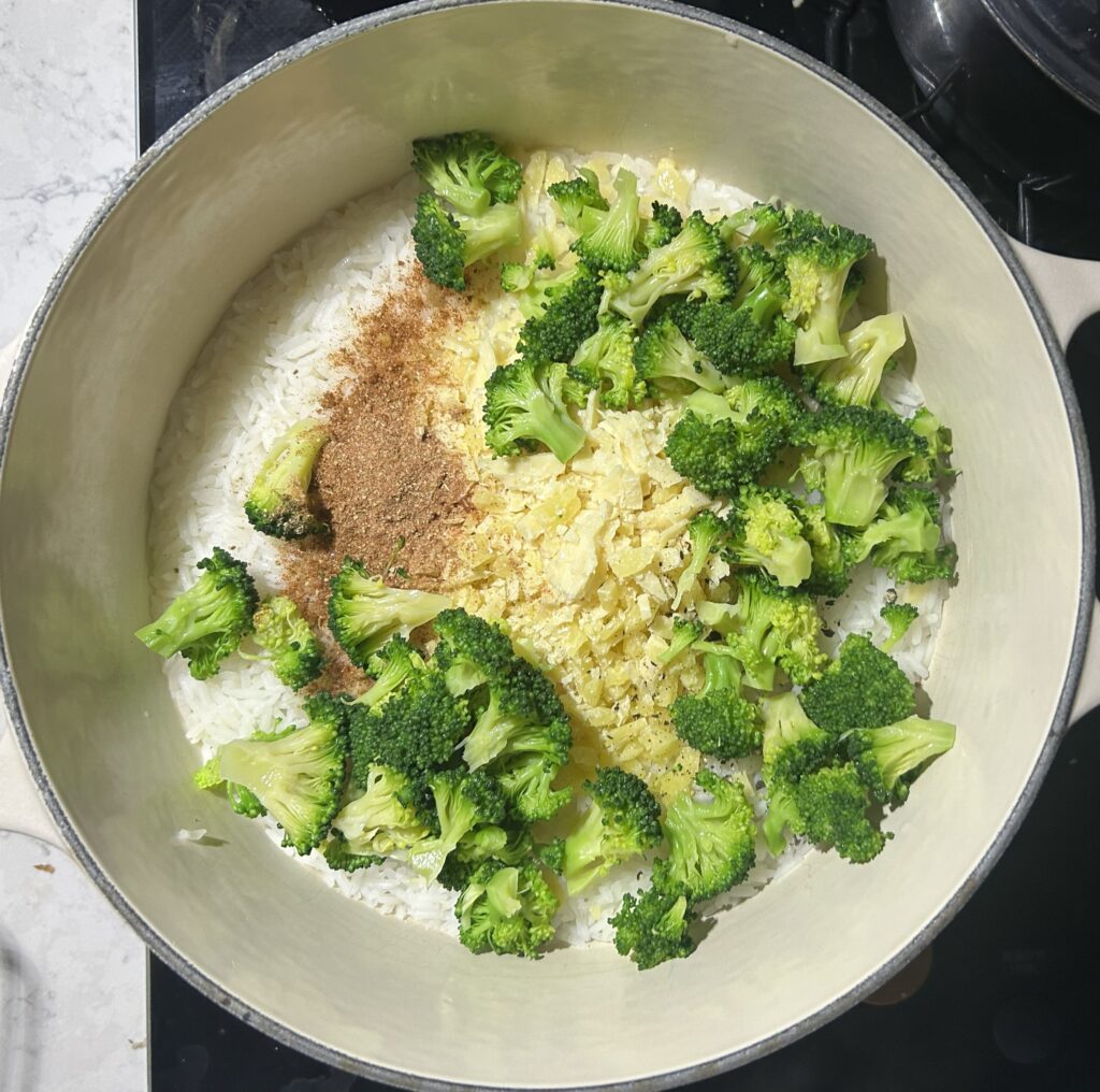❹ブロッコリー、バター、細かく刻んだチーズ、塩、黒胡椒、ガーリックパウダー、パプリカを加えて、全体を混ぜ合わせる。蓋をして、予熱で、15分程度蒸らす。