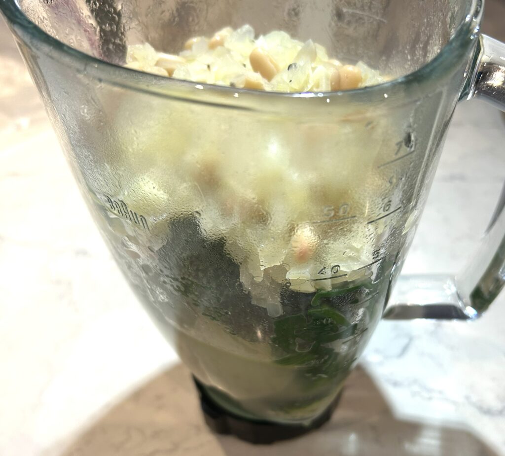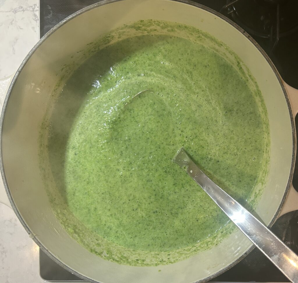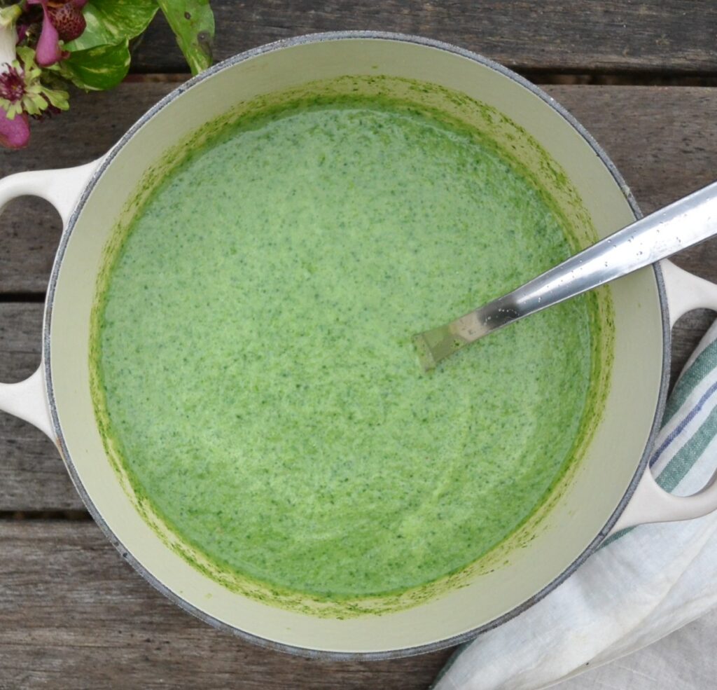 ❺❹ とブロッコリー、ほうれん草をミキサーにかけて、ピューレ状にする。鍋に戻して、軽く温める。水又はブロスを足して、好みの硬さに調節する。
