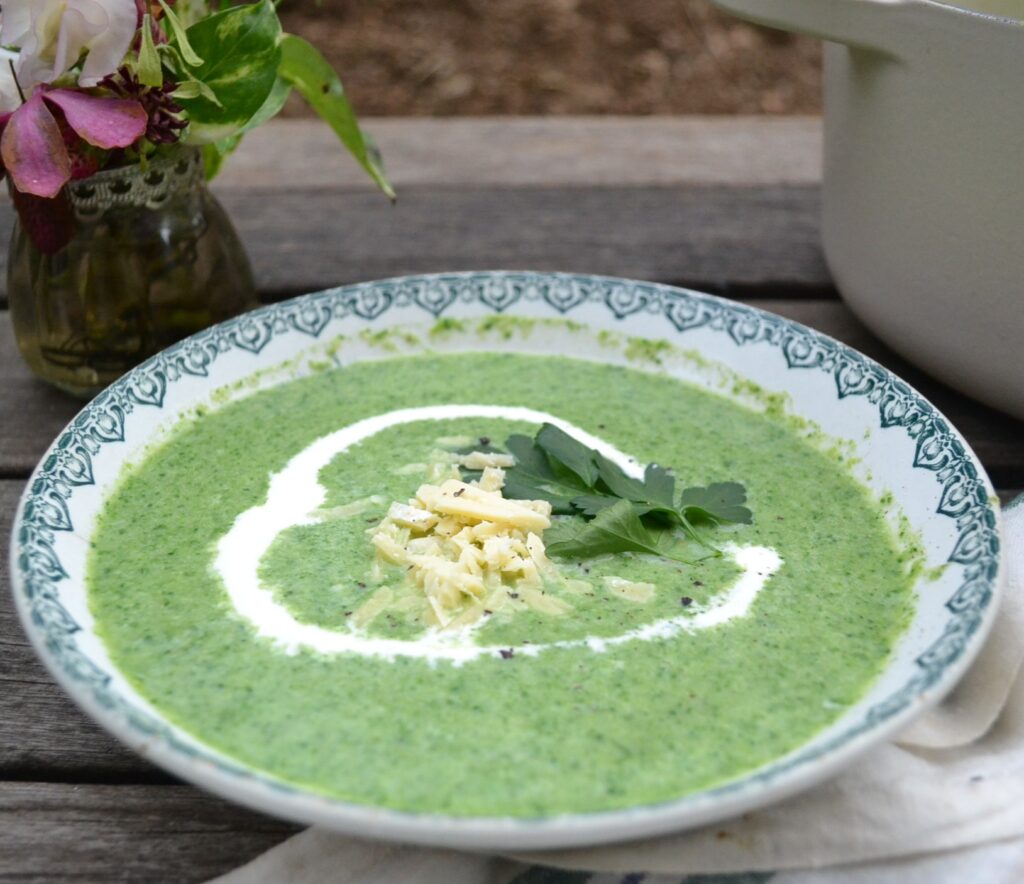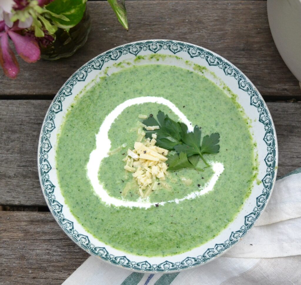 白いんげん豆とブロッコリーをピューレ状にした、ブロッコリーとホワイトビーンのスープです。少量のほうれん草もピューレ状にして加えているので、緑色の鮮やかな色合いが美しいです。白いんげん豆を加えているので、ボリューム感があって、濃厚な仕上がりです。好みで、ブロッコリーと相性がよいチェダーチーズを加えたり、生クリームやサワークリームを添えて、頂きます。