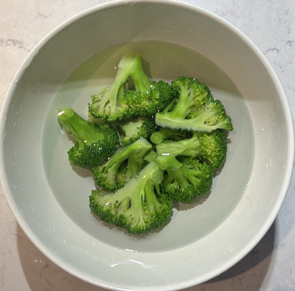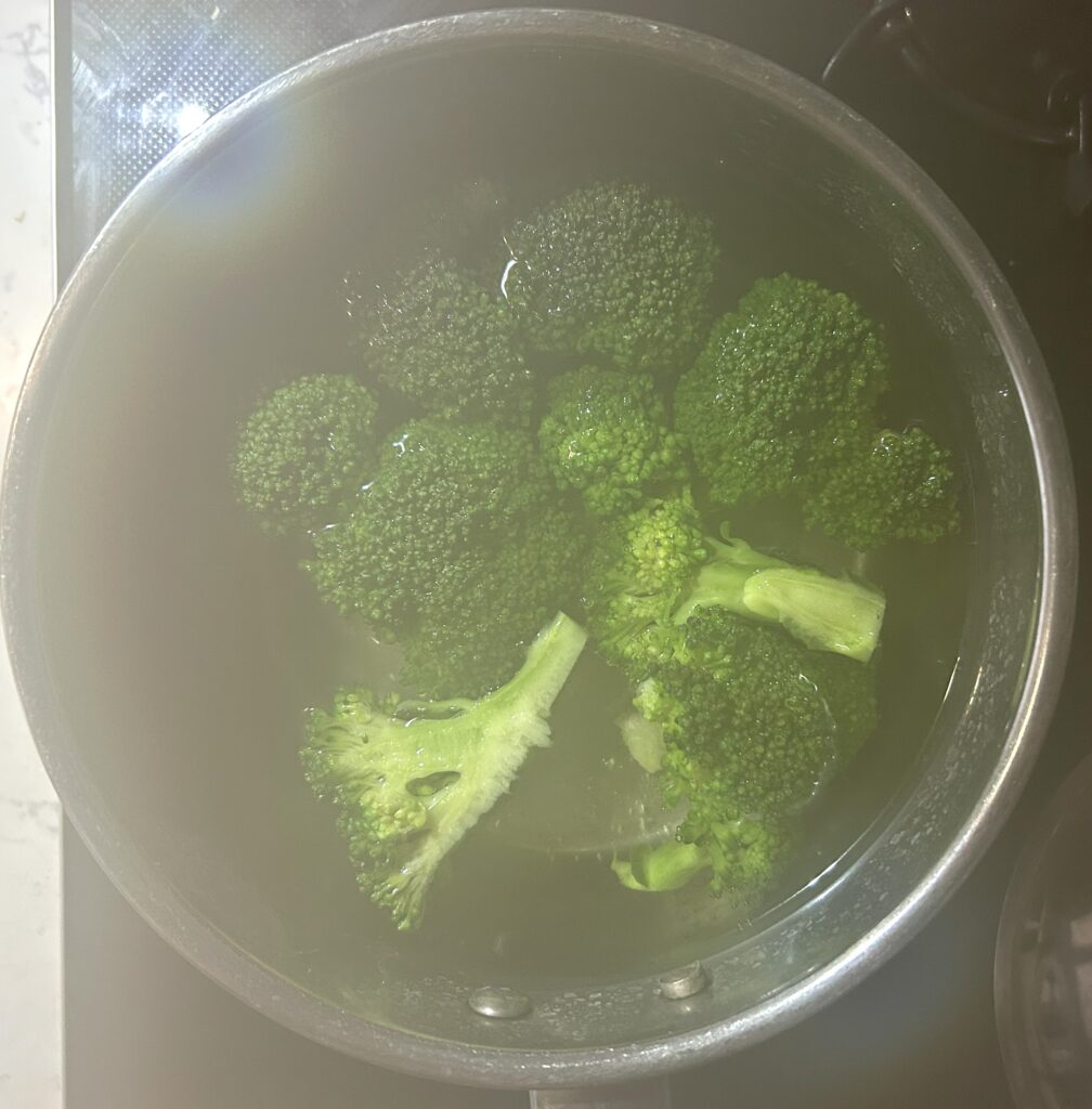 ブロッコリーは、下茹でしてから使います。冷凍のブロッコリーを解凍して、使っても大丈夫です。ブロッコリーは幹と葉を取り除き、茹でやすい大きさにそろえます。鍋に熱湯をわかし、ブロッコリーを入れて、色が鮮やかに変わるまで、3分程度火をとおします。