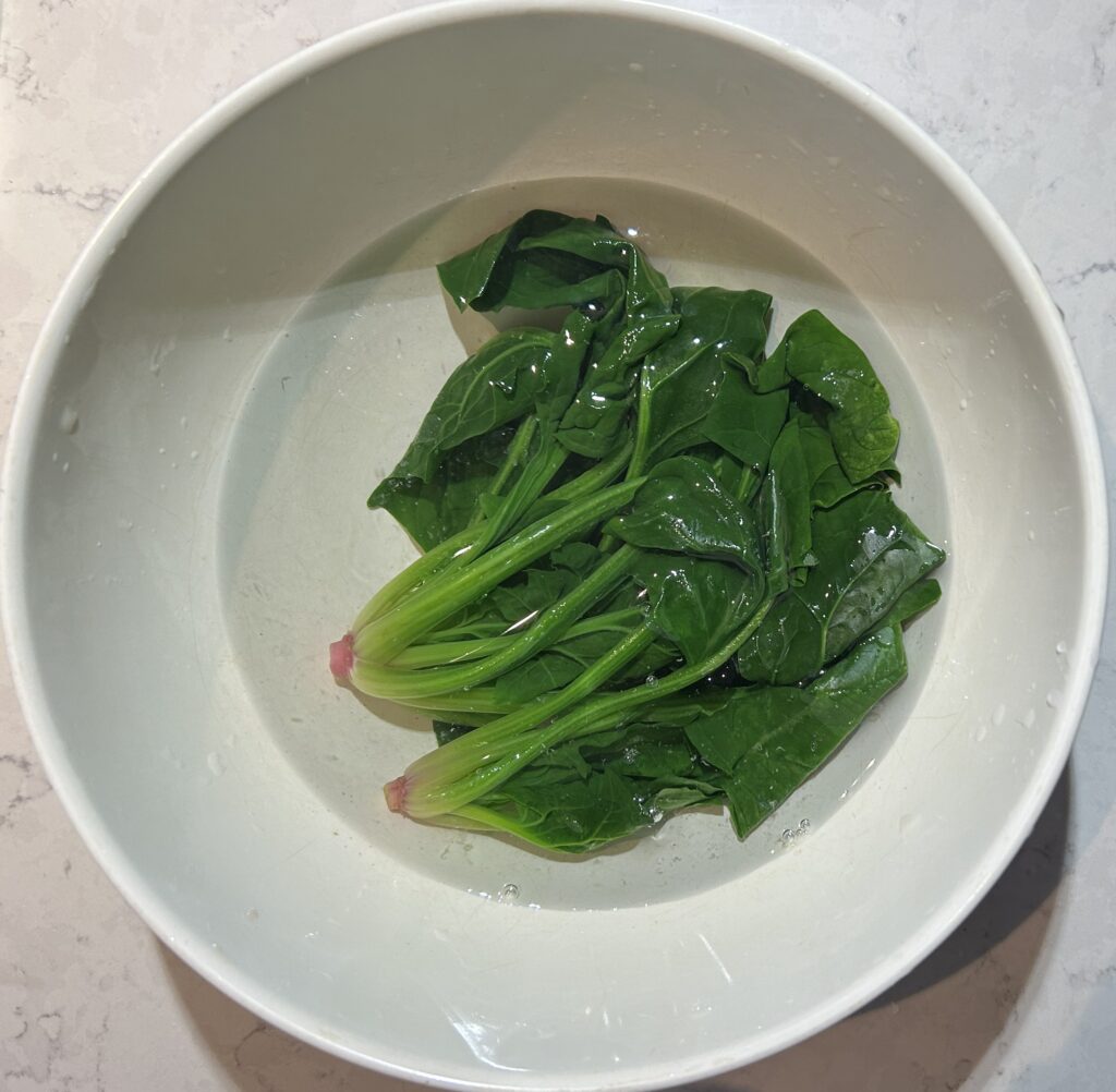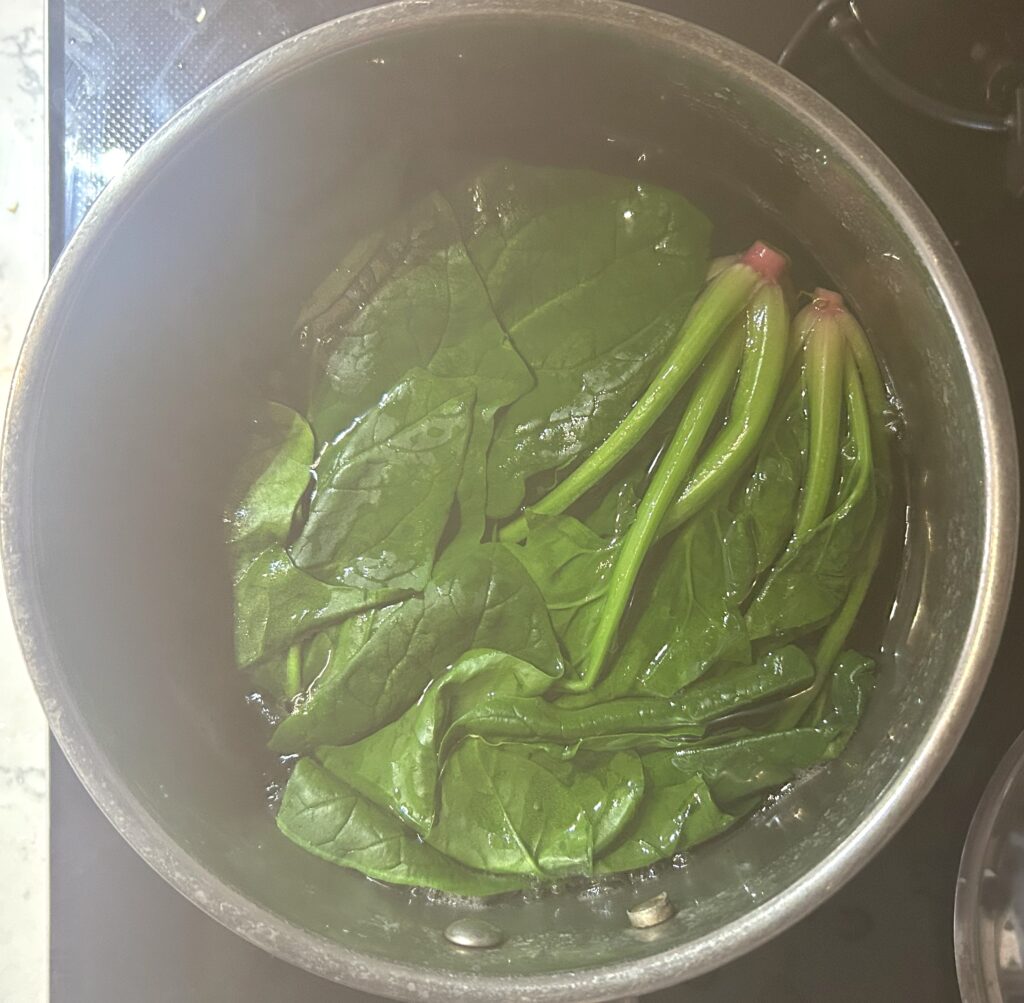 ほうれん草も同様に、熱湯でゆでます。ほうれん草も冷凍のものでもいいし、火を通さないで使える、生食用のべービースピナッチでもいいです。熱湯にほうれん草を入れて、しんなりとしたら、冷水につけて冷まします。