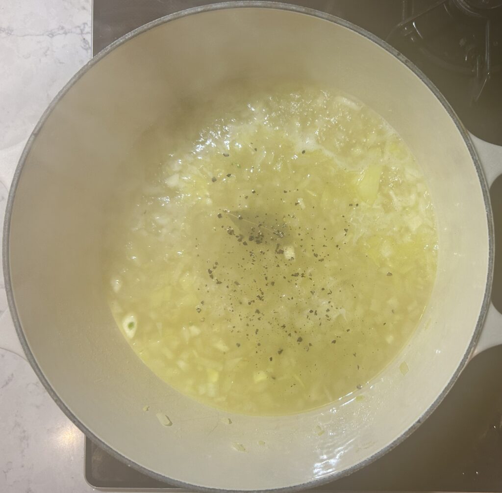 チキンブロスかベジタブルブロスを注ぎます。ローリエ、塩、黒胡椒を加えます。