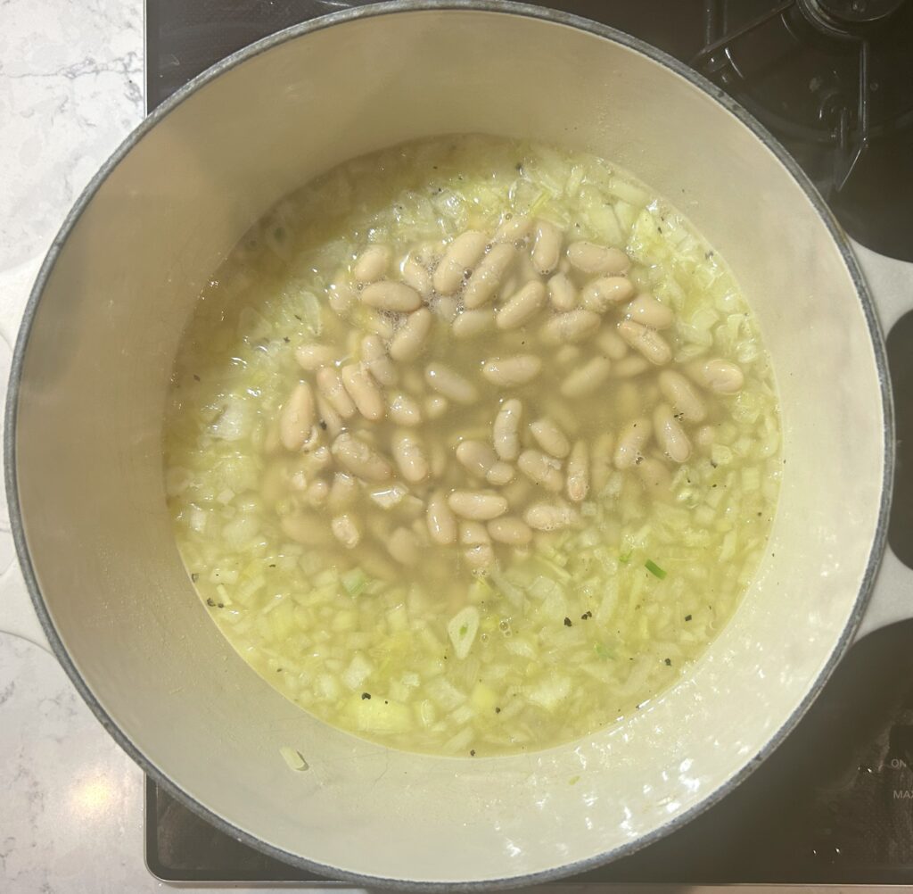 ❹ブロス、ローリエ、塩、黒胡椒を加えて、軽く混ぜ合わせる。水気をきった白いんげん豆を加えて、蓋をして、火を弱めて、10分程度煮る。