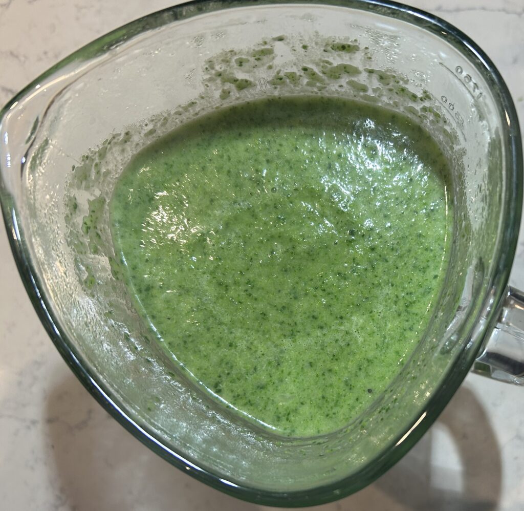 ミキサーに用意しておいた、ブロッコリー、ほうれん草、スープを入れて、ピューレ状にします。
