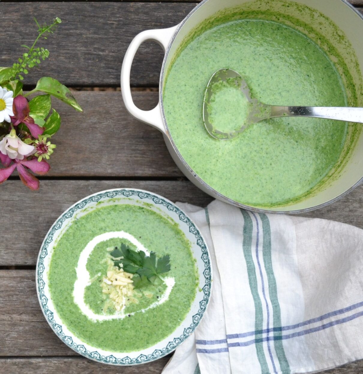 白いんげん豆とブロッコリーをピューレ状にした、ブロッコリーとホワイトビーンのスープです。少量のほうれん草もピューレ状にして加えているので、緑色の鮮やかな色合いが美しいです。白いんげん豆を加えているので、ボリューム感があって、濃厚な仕上がりです。好みで、ブロッコリーと相性がよいチェダーチーズを加えたり、生クリームやサワークリームを添えて、頂きます。