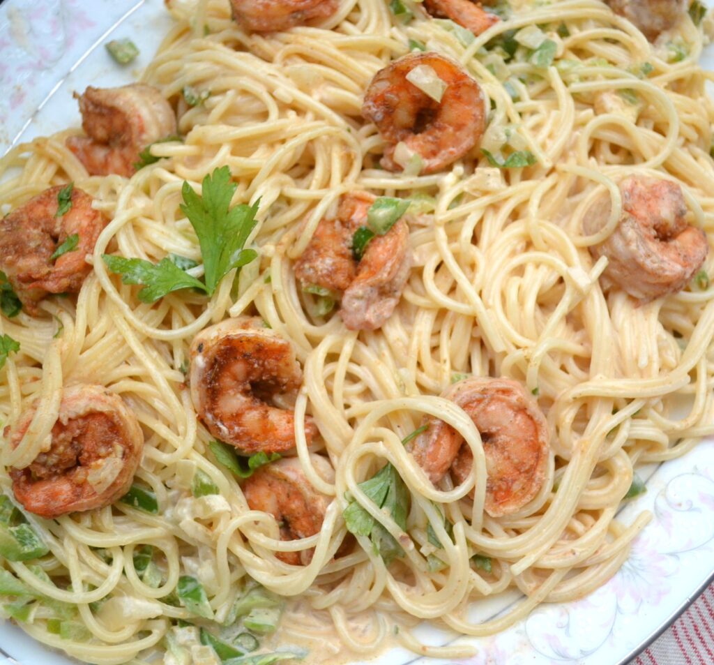 ケイジャンスタイルのスパイシーな海老を加えて、濃厚なクリームソースで和えた、ケイジャンシュリンプパスタ (Cajun Shrimp Pasta) です。クレオールスパイスは、ルイジアナ州の料理で頻繁に使われるミックススパイスですが、これを使うと、普段作っている料理が、たちまちケイジャン風になります。少量のクリームチーズとトマトペーストを加えて、マイルドに仕上げています。パスタは、好みの種類で構いませんが、スパゲッティーなどのロングパスタの方が、クリームソースが絡みやすく、よりソースの風味を楽しめます。