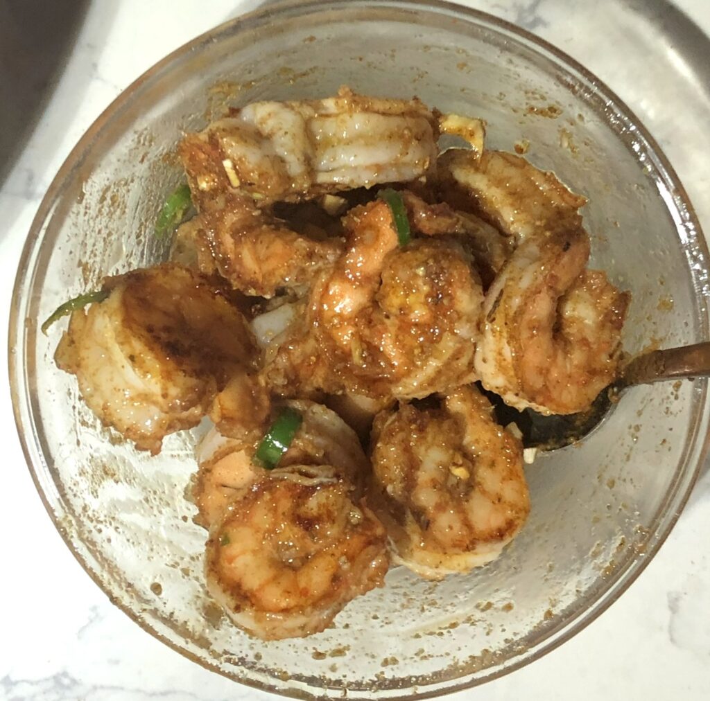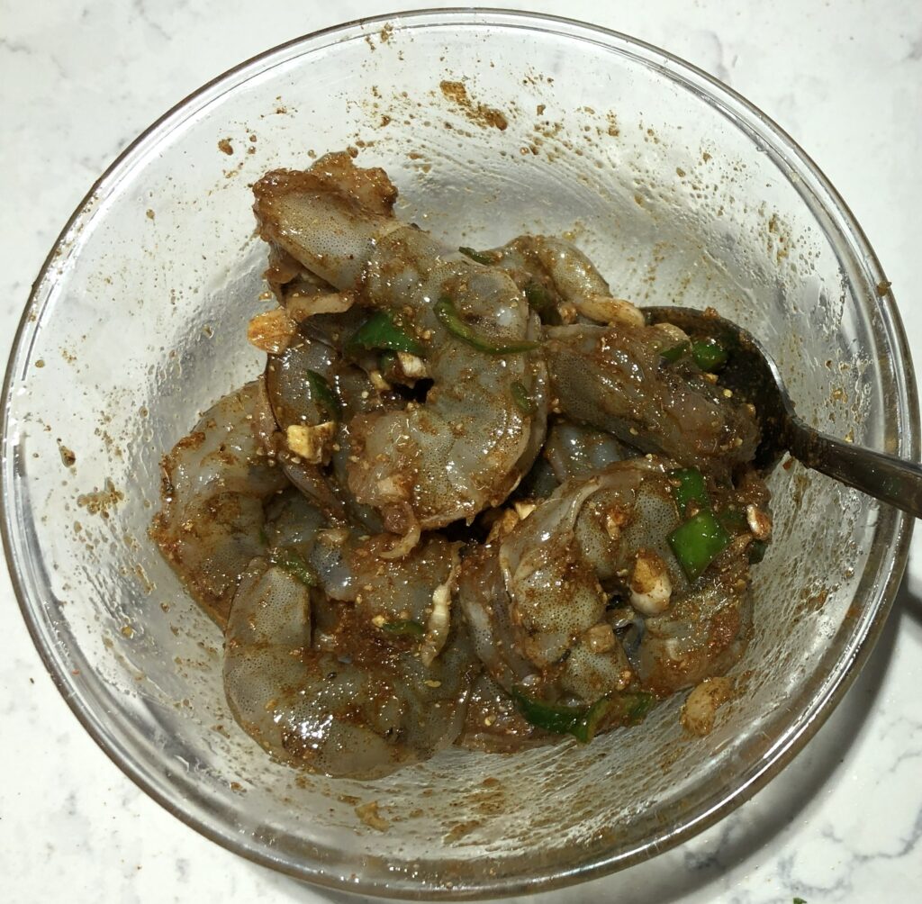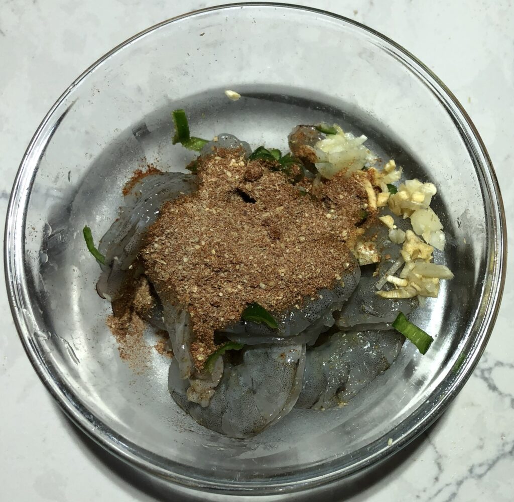 海老は皮をむいて、背ワタを取り除きます。海老にクレオールスパイス、塩、微塵切りにしたニンニクと青唐辛子、オリーブオイルをまぶして、30分程度ねかしておきます。