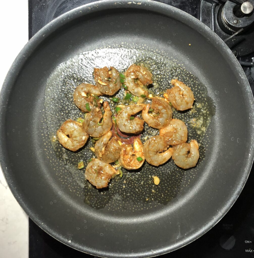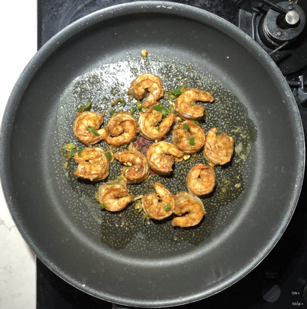 フライパンを中火にかけて軽く熱し、オリーブオイルを少量ひいて、海老を焼きます。