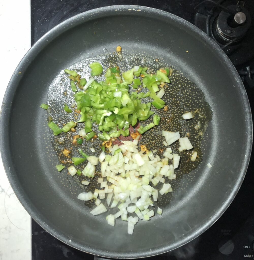 同じフライパンで、微塵切りにした玉ねぎとピーマンを入れて、炒めます。