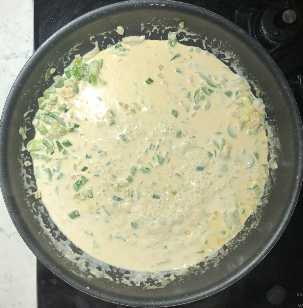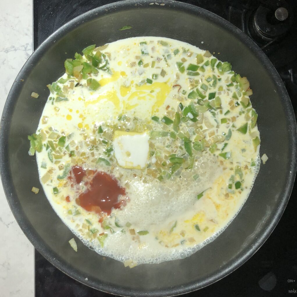 ❺玉ねぎとパプリカ (又はピーマン)を入れて炒める。野菜がしんなりとしてきたら、生クリーム、パルメジャーノチーズ、トマトペースト、バターを加えて混ぜ合わせる。