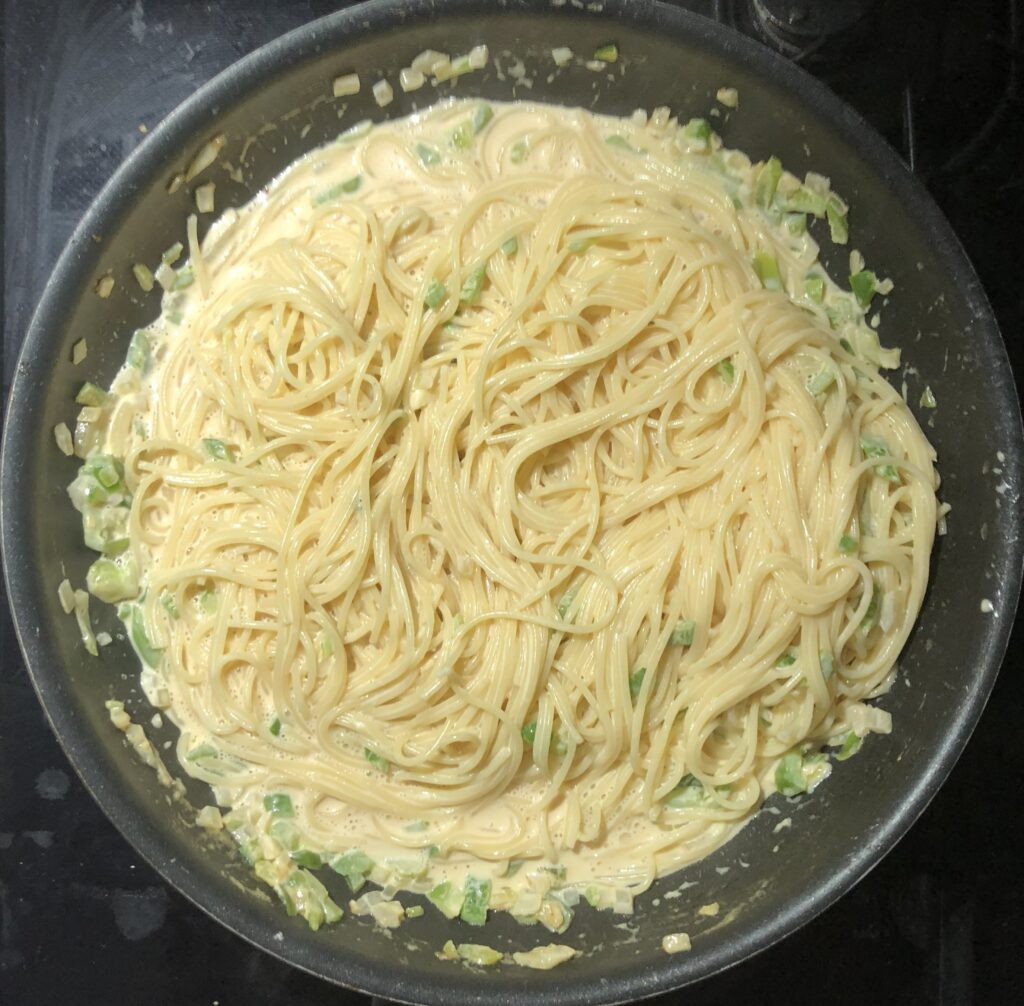 硬めに茹でた、パスタを加えて、ソースを絡めます。ソースの硬さは、少量のパスタのゆで汁を加えて、調節します。
