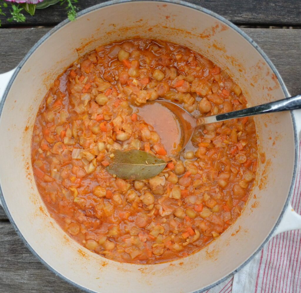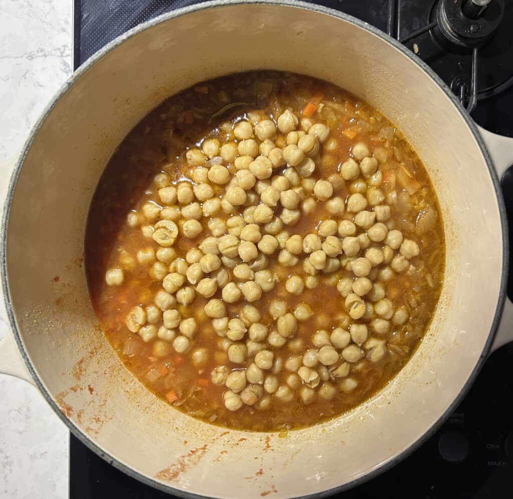 調理したひよこ豆を、水気をきってから、加えます。火を弱めて、10分程度、ひよこ豆が水分を吸収して、少し煮崩れてくるまで煮ます。