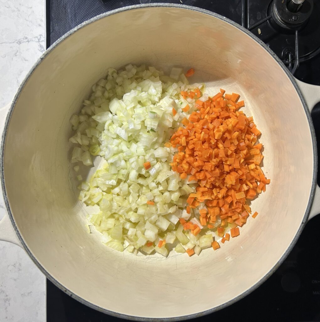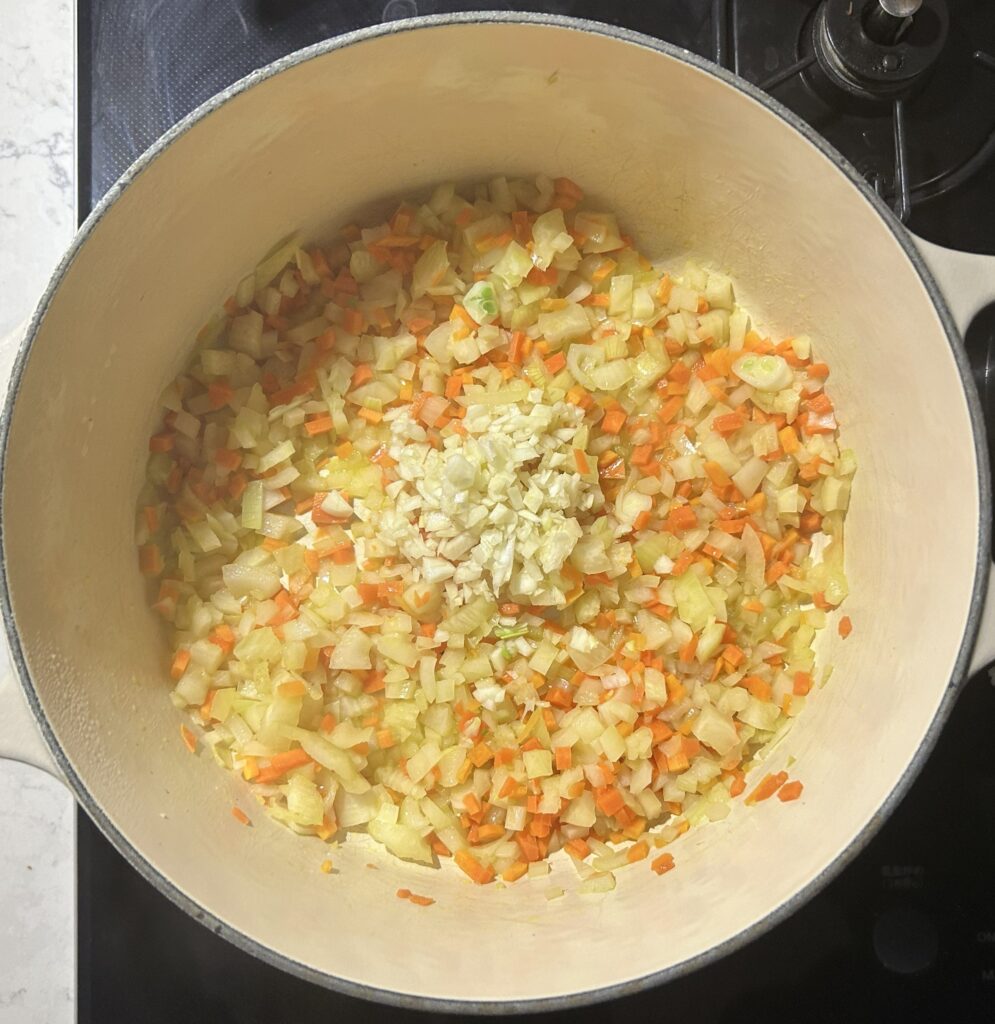 スープのベースとなる、野菜を用意します。玉ねぎ、セロリ、人参を微塵切りにします。鍋にオリーブオイルをひいて、中火にかけます。野菜を加えて、玉ねぎがしんなりとするまで炒めます。