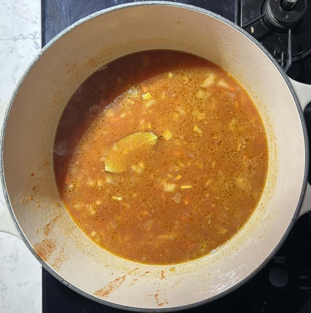 トマトピューレ、チキンブロスやベジタブルブロス、ローリエを加えます。ブロスがなかったら、水だけで作っても、野菜やスパイスのうま味で十分美味しいです。