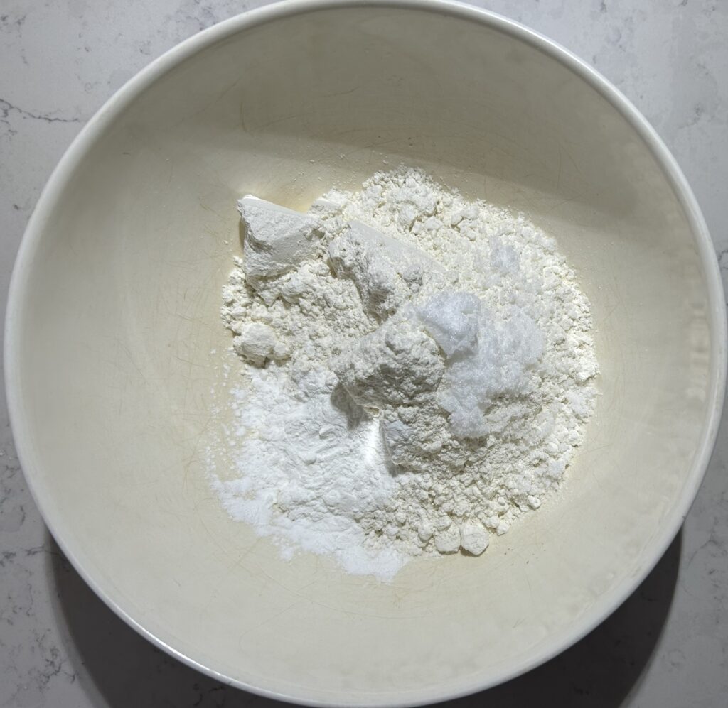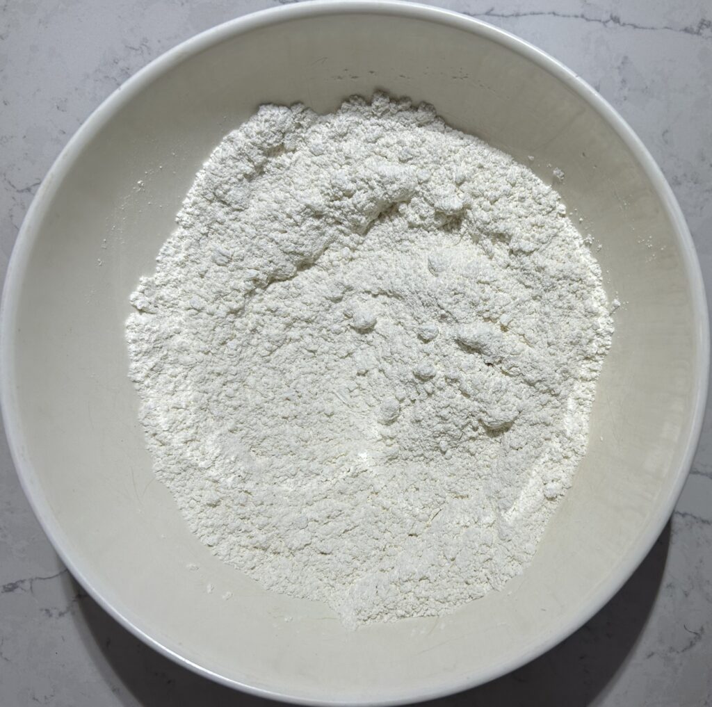 スコーンもビスケットも、基本的な作り方は皆同じで、最初に小麦粉、ベーキングパウダー、砂糖などの粉類をボールに入れて、軽く全体をかき混ぜます。泡立て器などを使って、砂糖や小麦粉の塊がなくなるようにします。