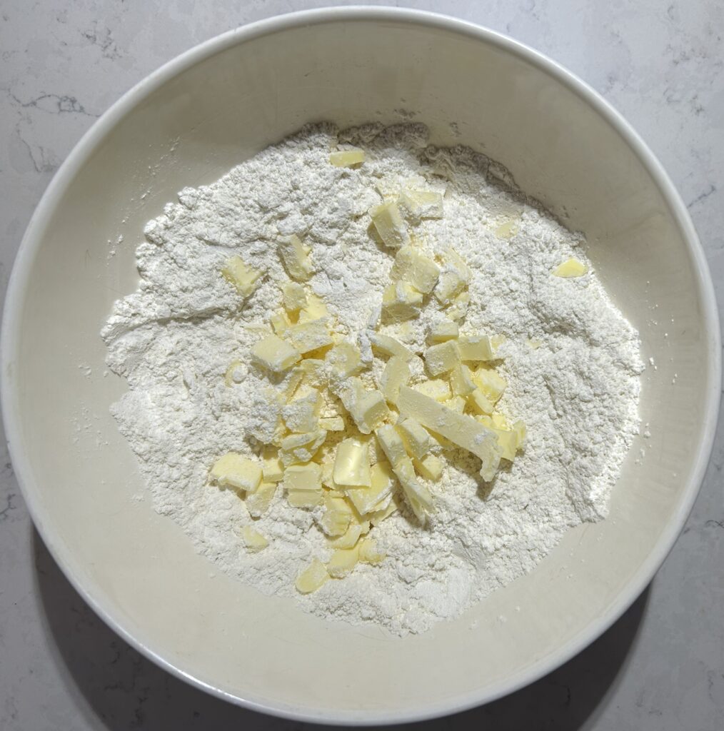 ❷ボールに、小麦粉、ベーキングパウダー、砂糖を入れて、よく混ぜ合わせる。さらに、細かく刻んだバターを加えて、生地に練りこむようにして、混ぜ合わせる。