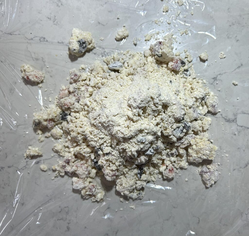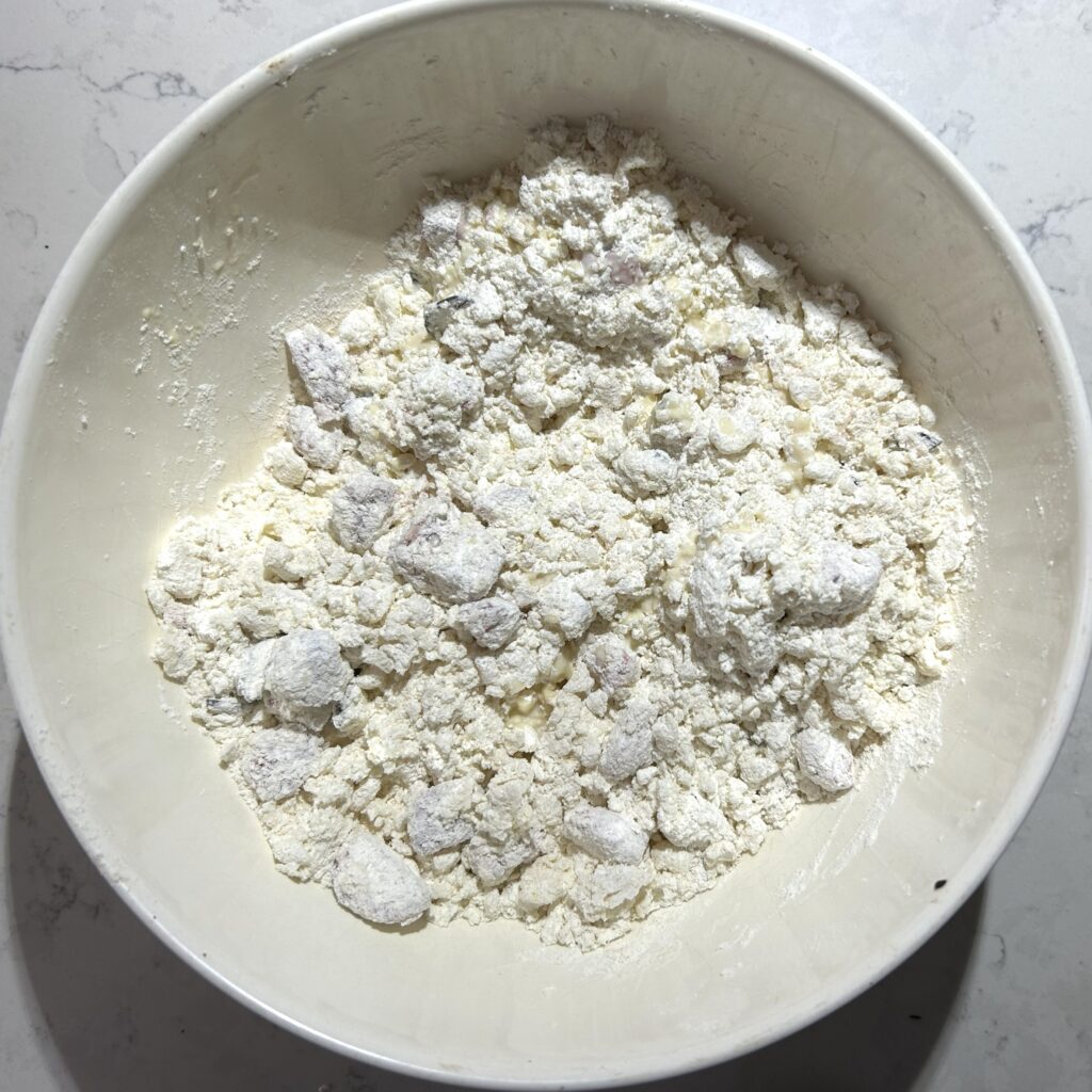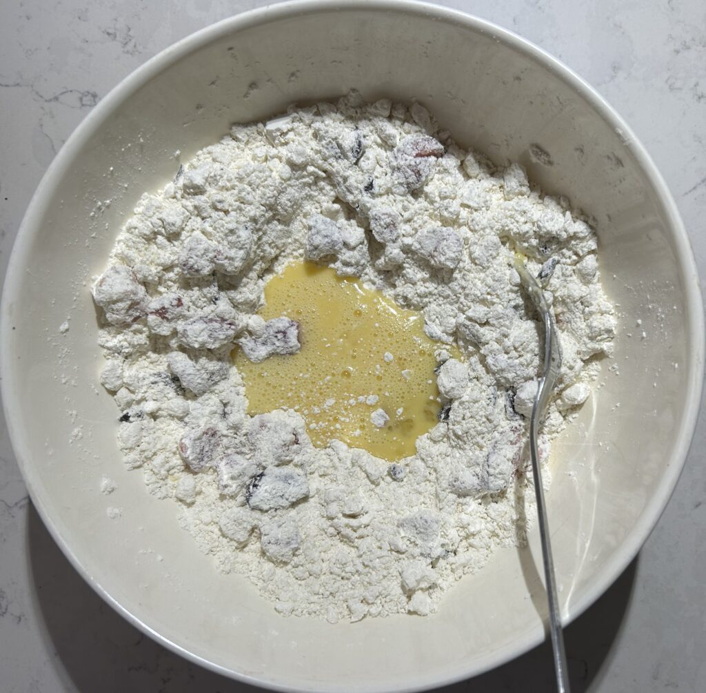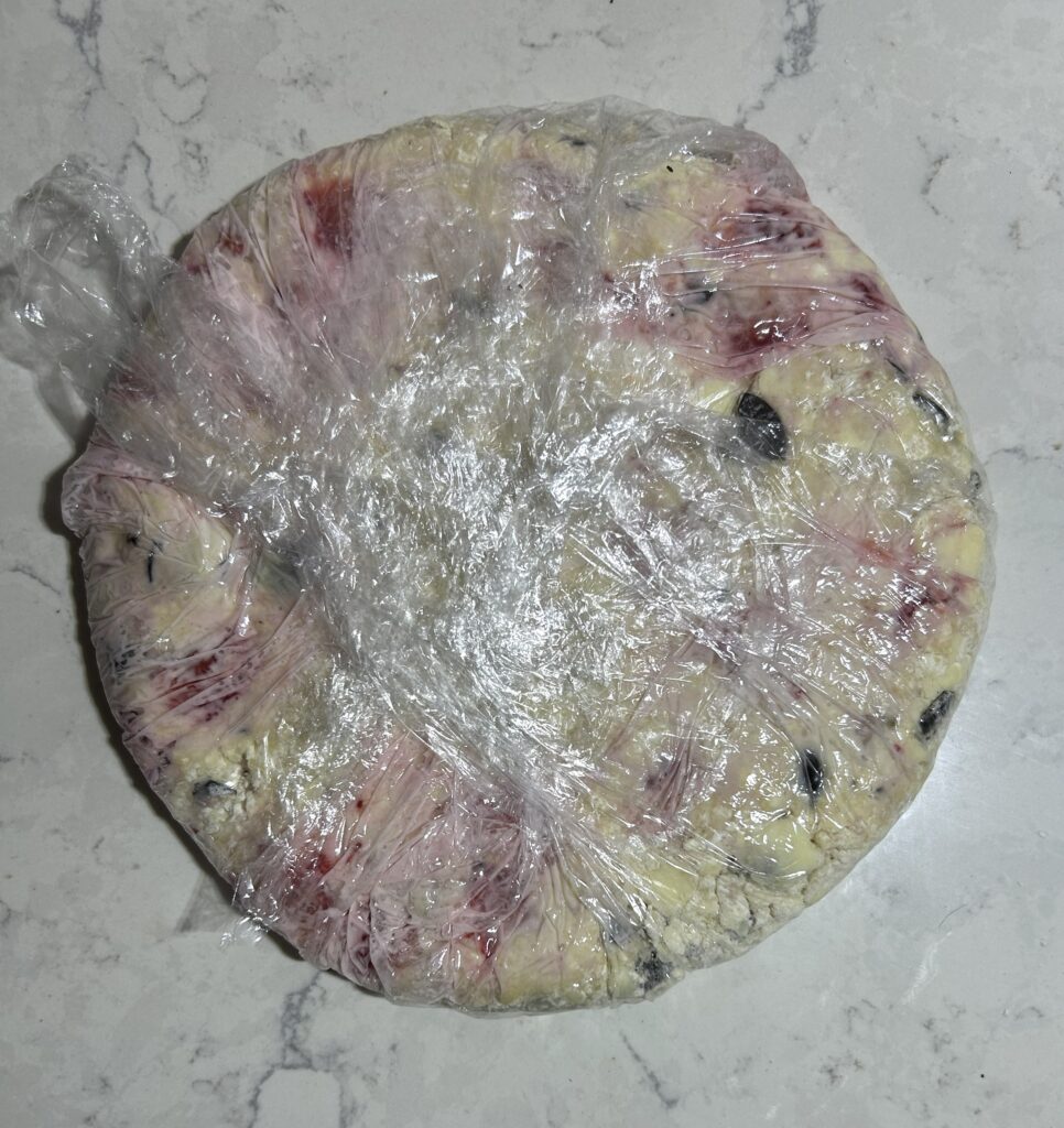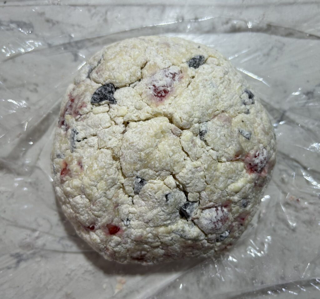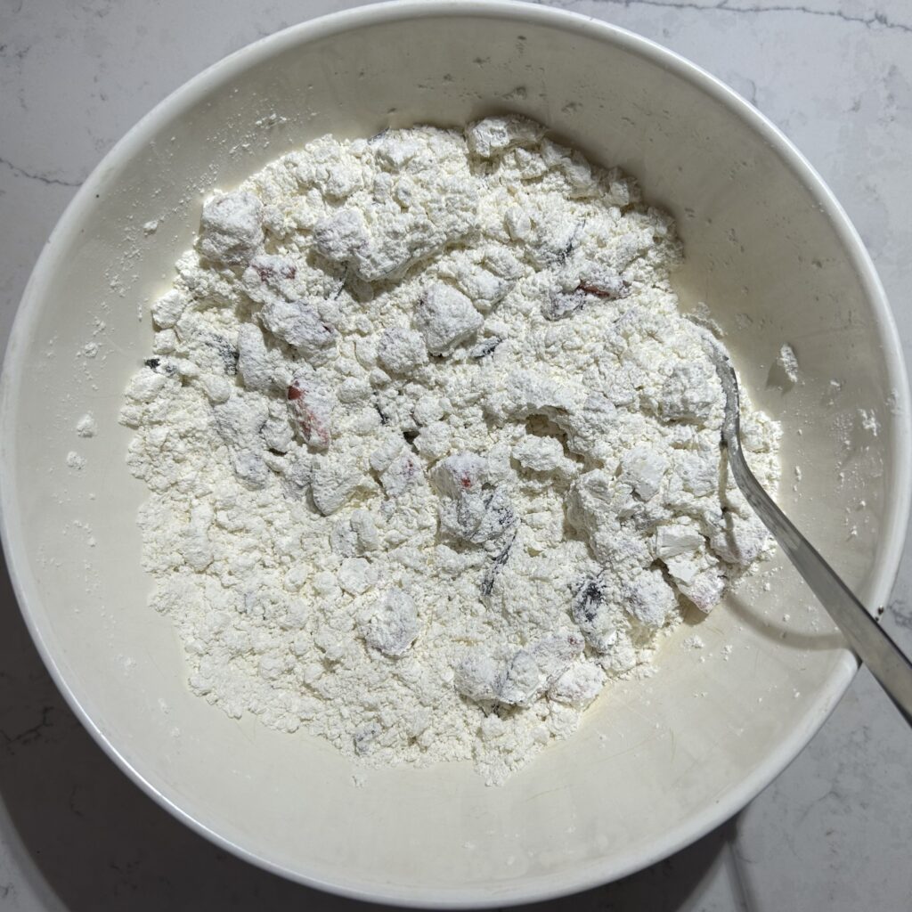 全体をさっくりと混ぜ合わせます。苺から水分がでてくるので、スコーンを形成する前の生地は、水分が少な目で、粉っぽさが残るくらいで丁度よいです。