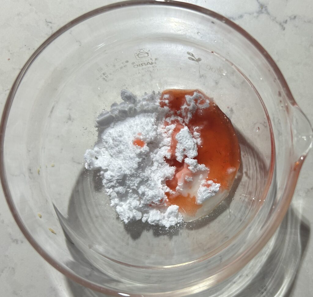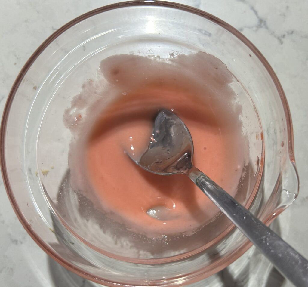 ❽粉砂糖に、レモンと苺の果汁を加えて、よく混ぜ合わせて、アイシングを作る。