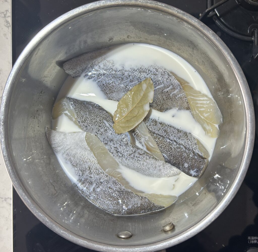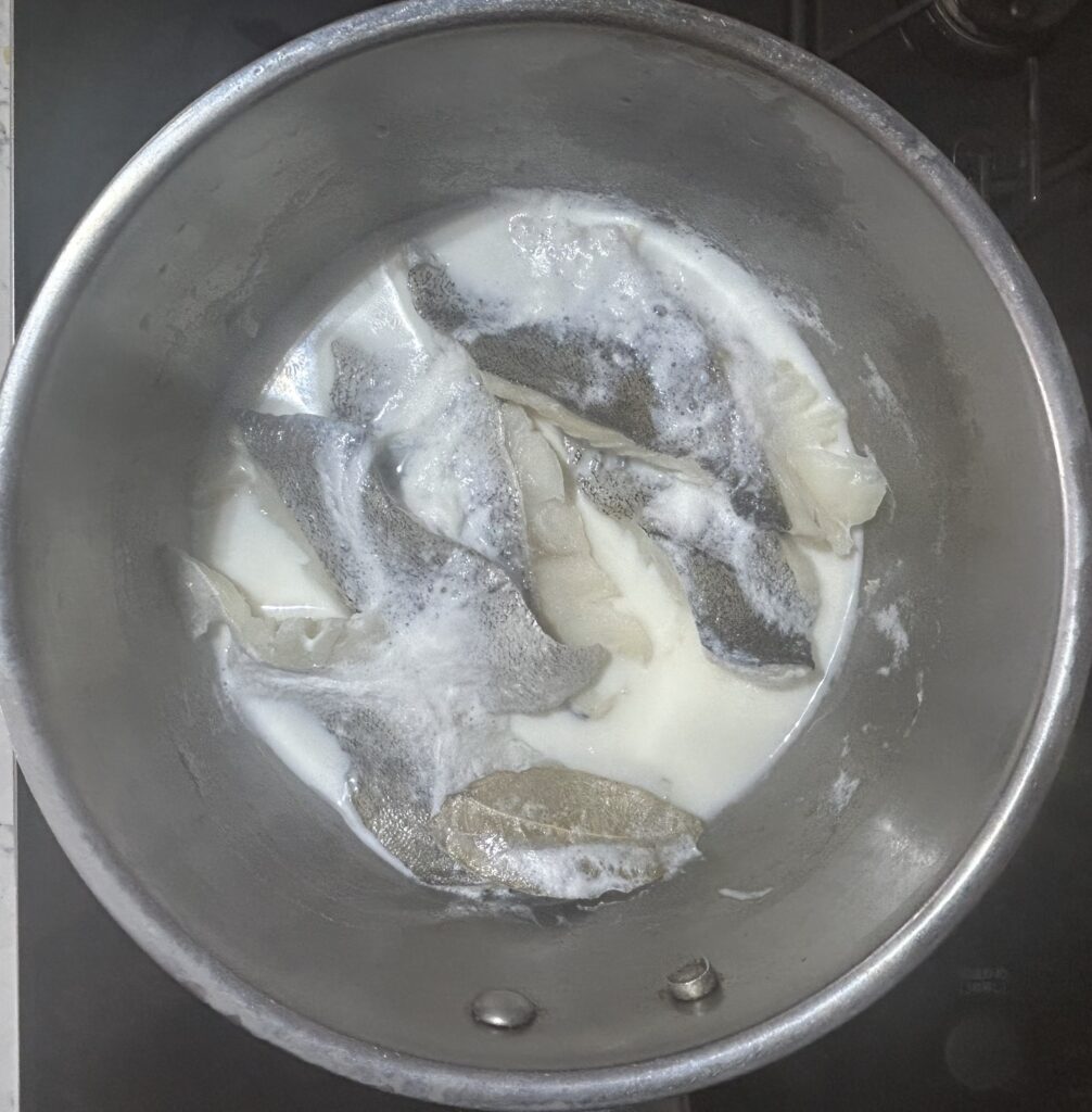 鱈は、牛乳で茹でて、臭みを抜きます。鱈と少量の牛乳、ローリエを鍋に入れて、中火にかけます。