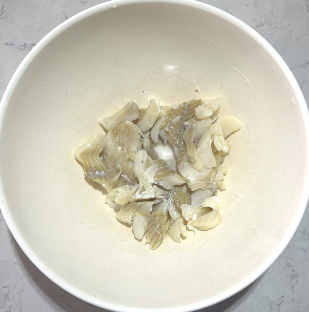 鱈が冷めたら、皮と骨を取り除き、大きめに身を崩します。