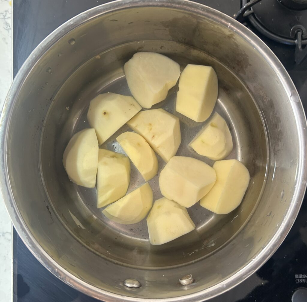 ❸じゃがいもは皮をむいて、茹でやすい大きさに切る。じゃが芋と水を鍋に入れて、中火にかける。沸騰したら、火を弱めて、じゃが芋が軟らかくなるまで、10分程度茹でる。