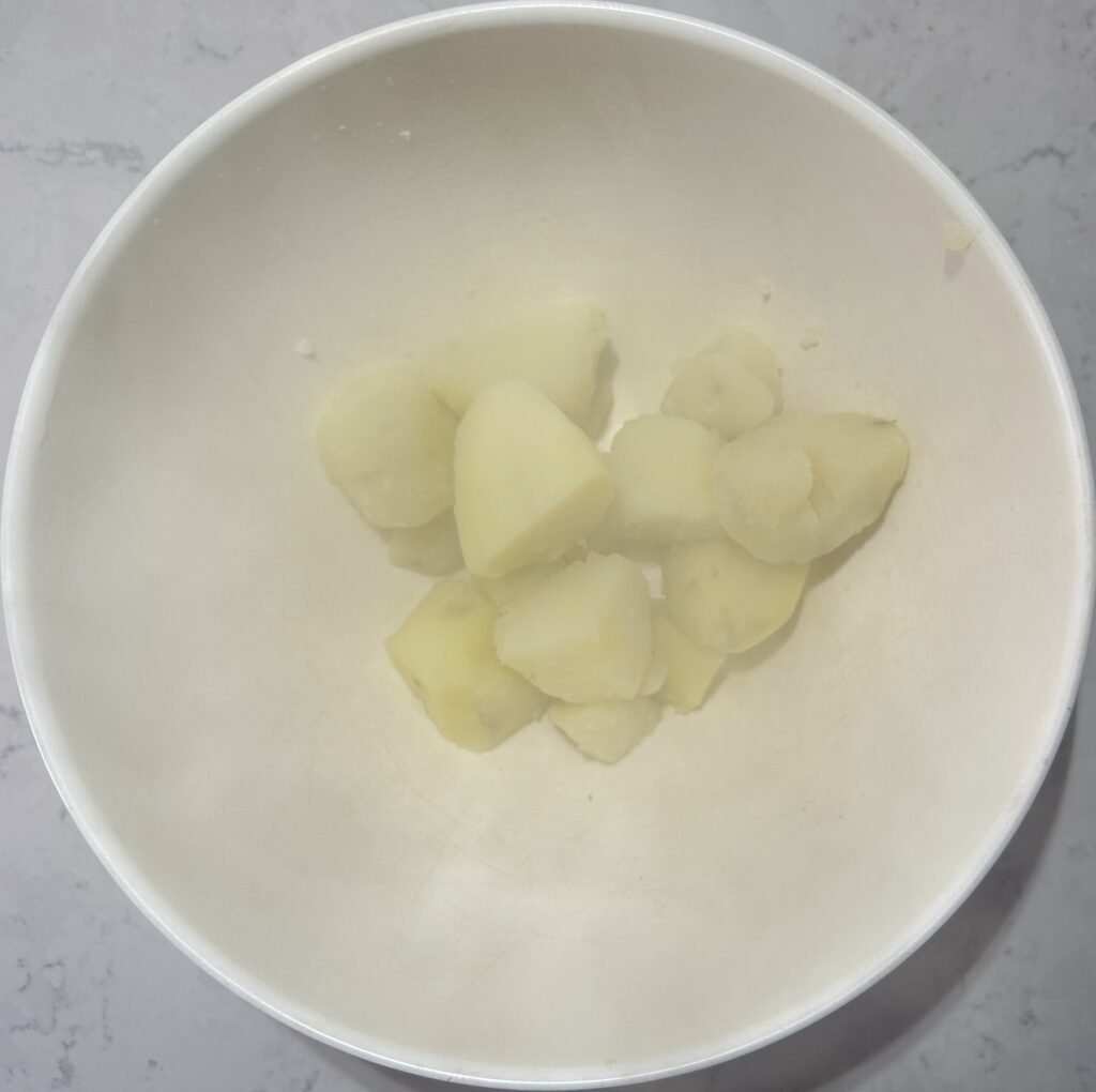 ❹茹で上がったジャガイモは皮をむいて、熱いうちにマッシャーや泡立て器で、つぶしておく。