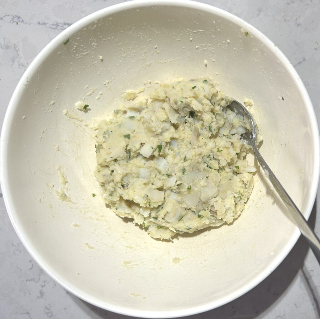 ❺じゃがいもと鱈、みじん切りにしたハーブの葉、塩、黒胡椒、パプリカを加えてよく混ぜ合わせる。