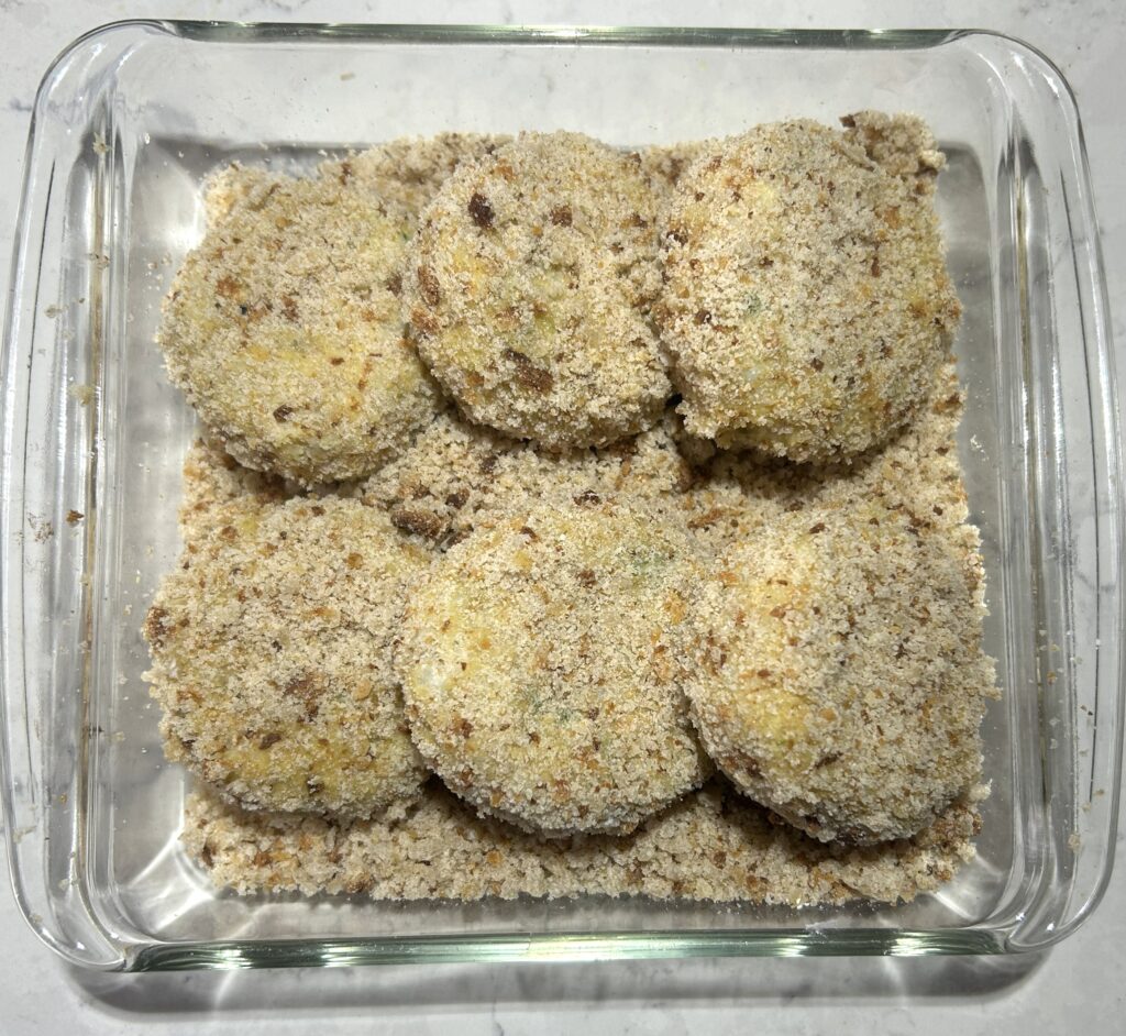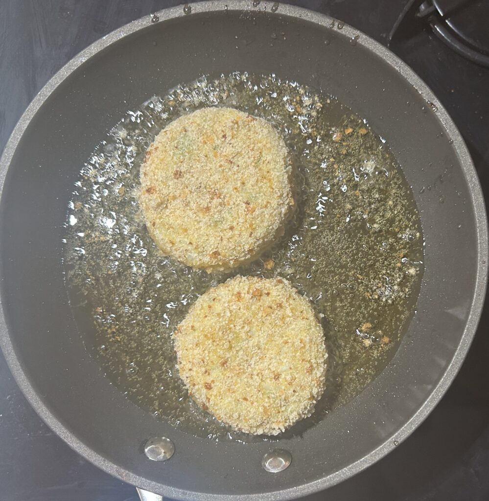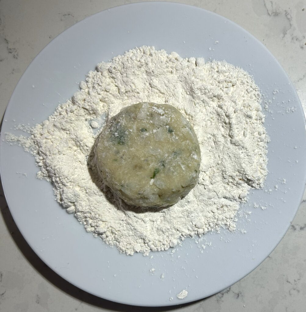 平たい円盤状に形成して、豚カツを作る要領で、衣をつけていきます。最初に小麦粉をまぶします。