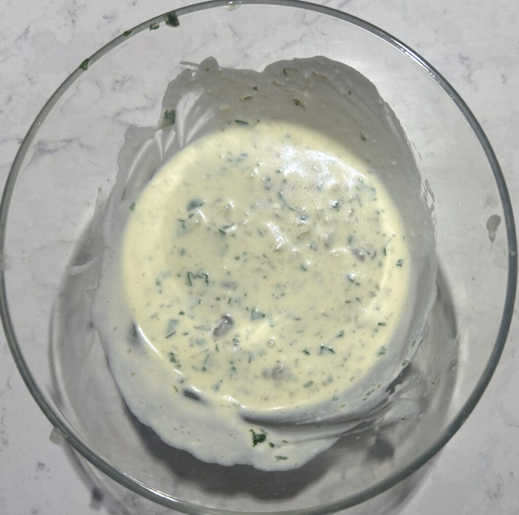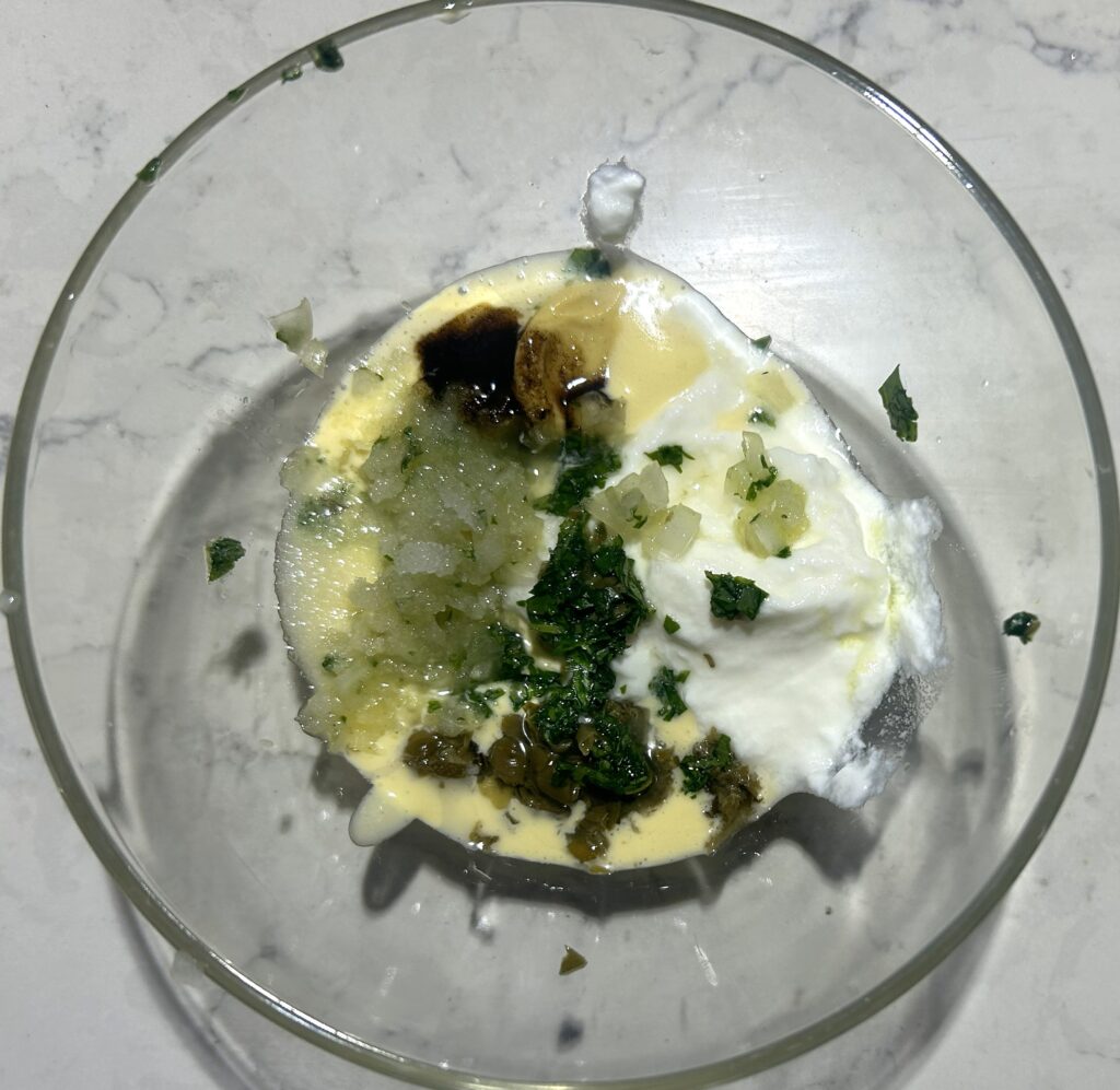 ❽タルタルソールを作る。ヨーグルト、マヨネーズ、ディジョンマスタード、ウースターソース、レモン汁、みじん切りにしたハーブ、細かく刻んだケッパーを混ぜ合わせる。塩で味を調える。