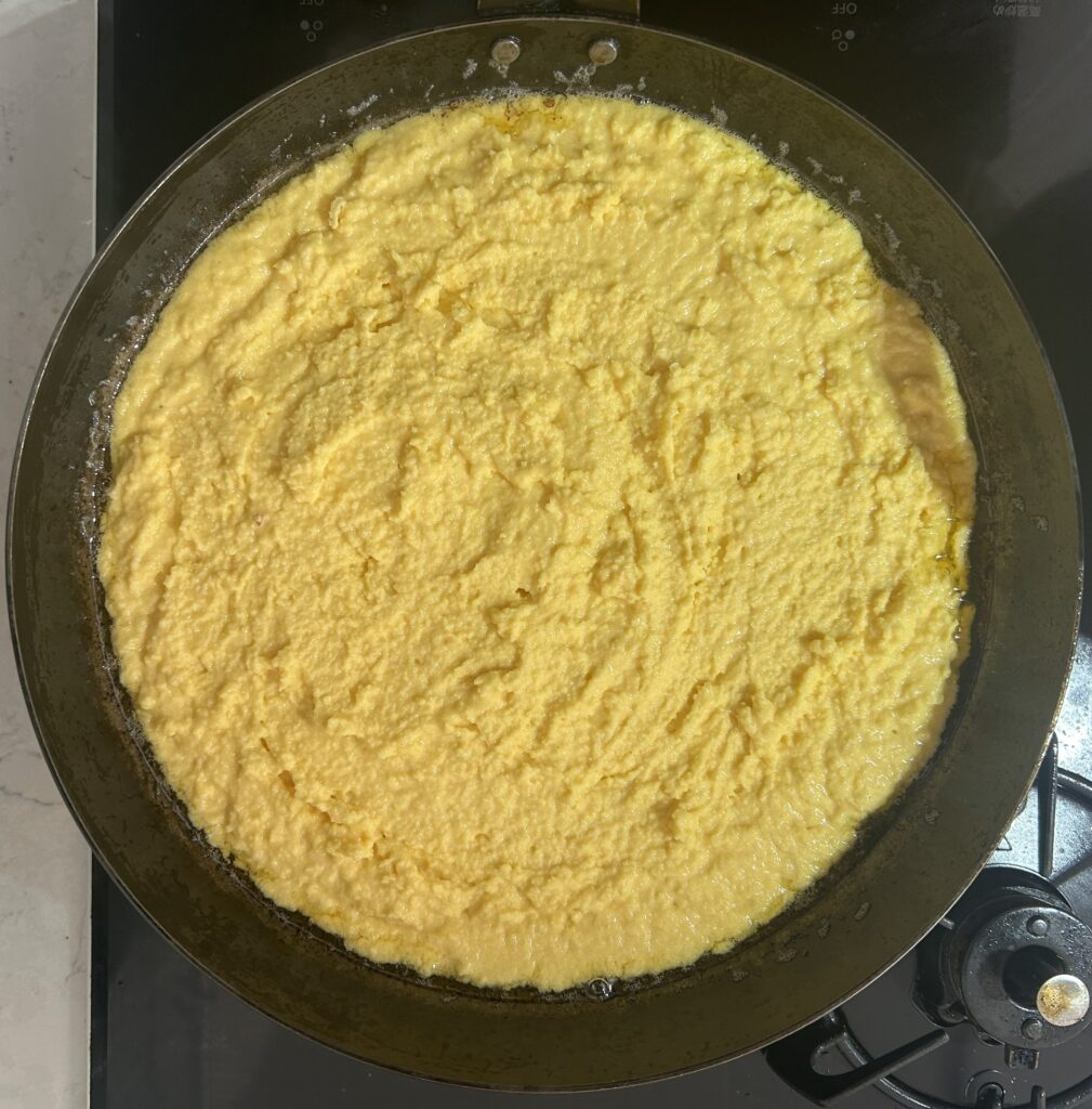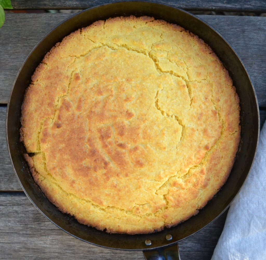 今回は、フライパンを使って、お砂糖は控えめにしたレシピで作っています。黄色いコーンミールを使い、バターミルクの変わりに、ヨーグルトと牛乳を使っています。コーンブレッドは、バターとの相性がいいので、軽くトーストして、溶かしたバターを添えると絶品です。パンケーキのように、甘いメープルシロップや蜂蜜をかけても、美味しいです。