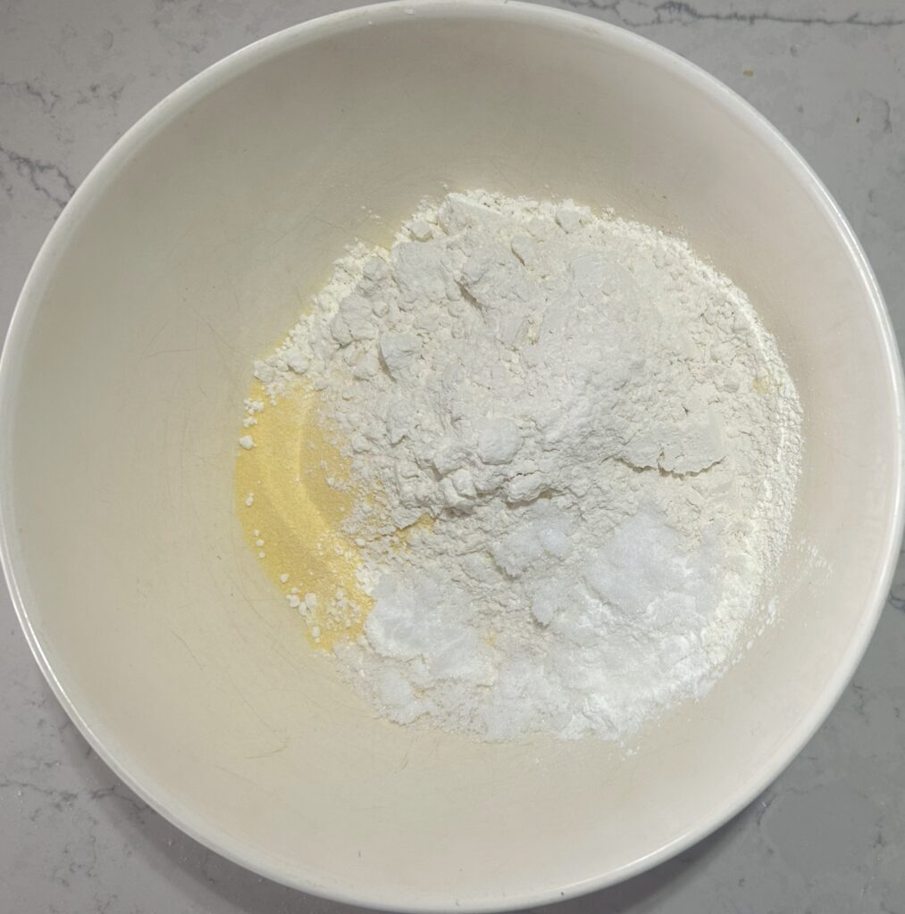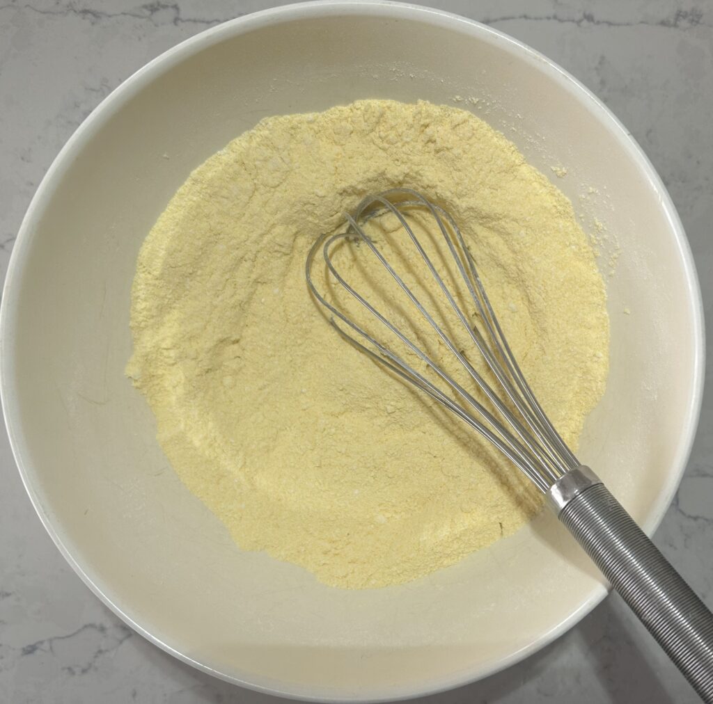 コーンブレッドは基本的に材料を合わせて焼くだけなので、とても簡単に作ることができます。まずは、コーンミール、小麦粉、塩、ベーキングパウダー、重曹、砂糖をボールに入れてよく混ぜ合わせます。重曹や小麦粉の塊がなくなればOKです。